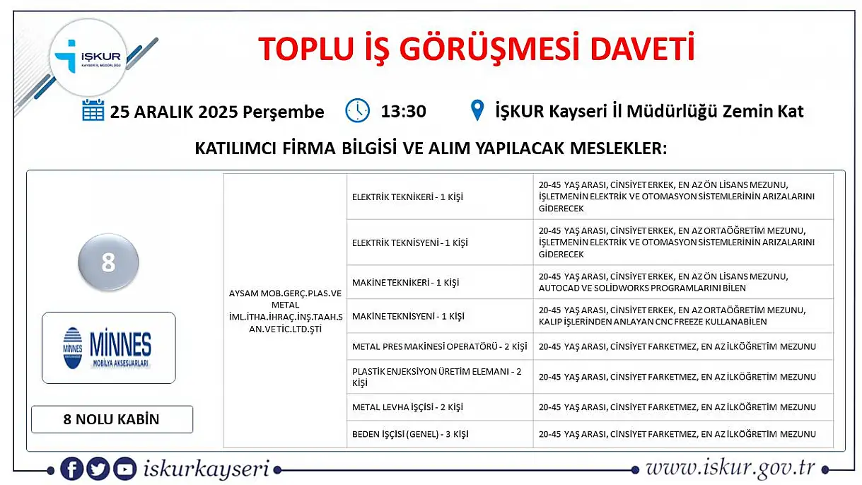 Kayseri'de 2025'in son fırsatı: Toplu iş görüşmesi ile 24 firma 598 yeni personel alacak!
