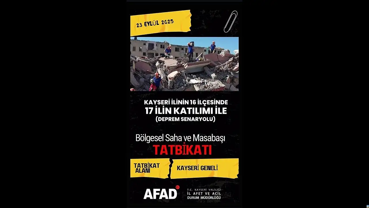 Kayseri, 23 Eylül’de şimdiye kadar görülmemiş bir tatbikata ev sahipliği yapmaya hazırlanıyor. AFAD öncülüğünde gerçekleştirilecek uygulama için 17 farklı ilden ekipler Kayseri’de buluşacak. Senaryo ise tamamen gerçekçi bir kurguyla şekillendirildi. Ancak başlangıç saati ve uygulamanın bazı kritik detayları henüz açıklanmadı.