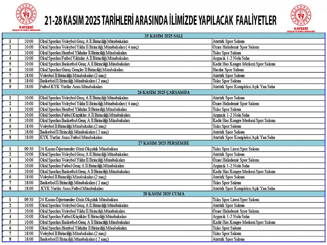 22 Kasım 2025 Cumartesi günü, satranç turnuvası ve badminton müsabakası, 23 Kasım Pazar günü badminton ve masa tenisi müsabakaları, 24 Kasım Pazar baraj geçme yüzme yarışması, 27,28 Kasım Perşembe ve Cuma günleri okçuluk müsabakaları düzenlenecek.