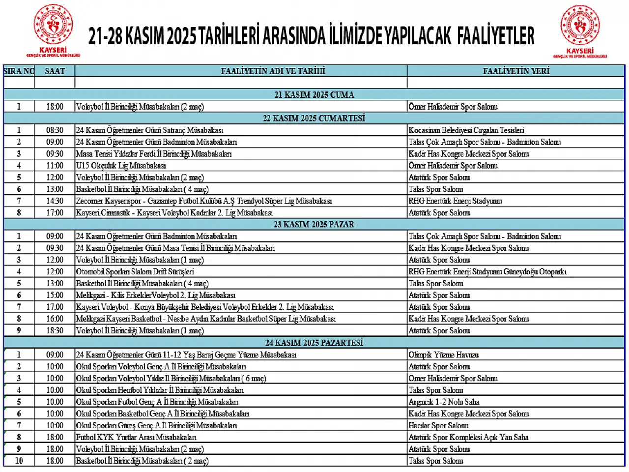 Kayseri Gençlik ve Spor İl Müdürlüğü 21 Kasım- 28 Kasım2025 tarihleri arasında kent genelinde düzenlenecek müsabakalarına ilişkin takvimi kamuoyu ile paylaştı. Detaylar Kayseri Anadolu Haber'de....