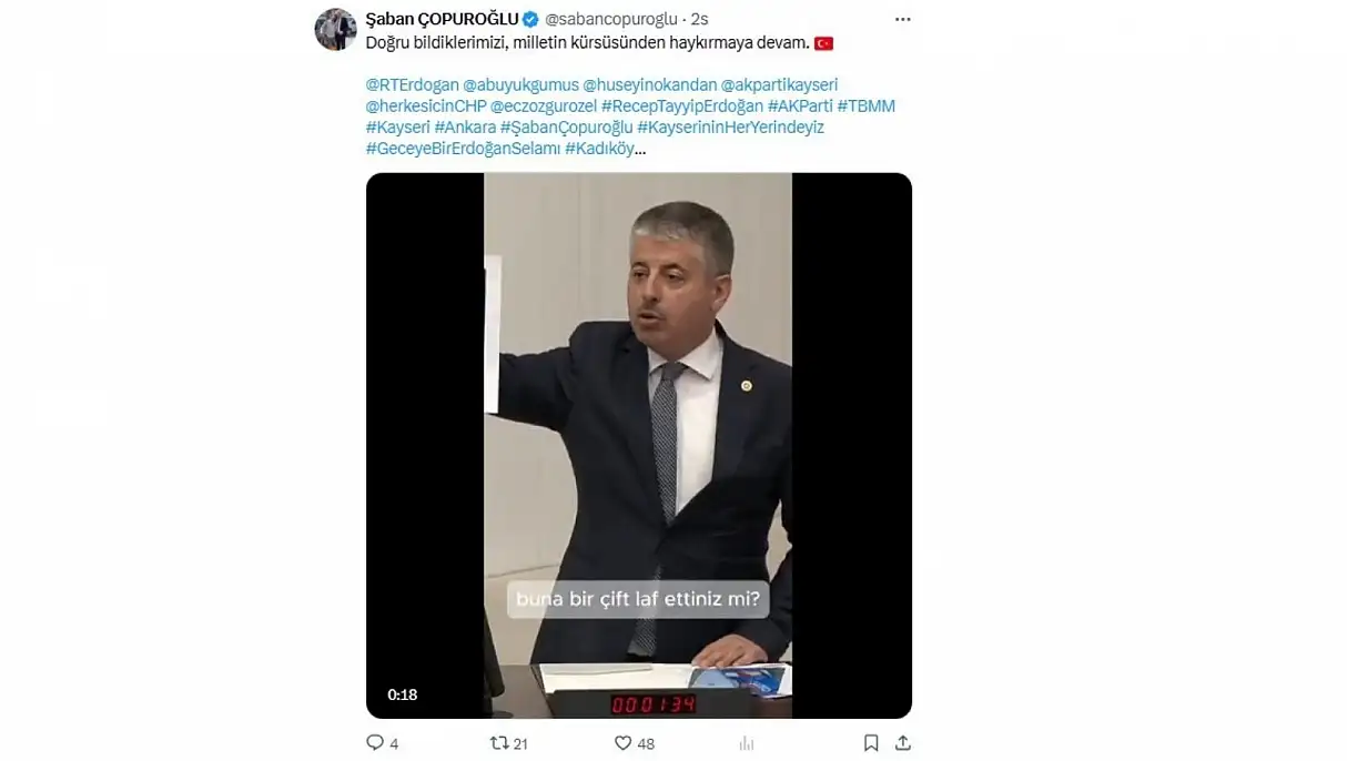 AK Parti Kayseri Milletvekili Şaban Çopuroğlu meclis kürsüsünde yaptığı konuşmayı ‘Doğru bildiklerimizi, milletin kürsüsünden haykırmaya devam’ açıklaması ile paylaştı.