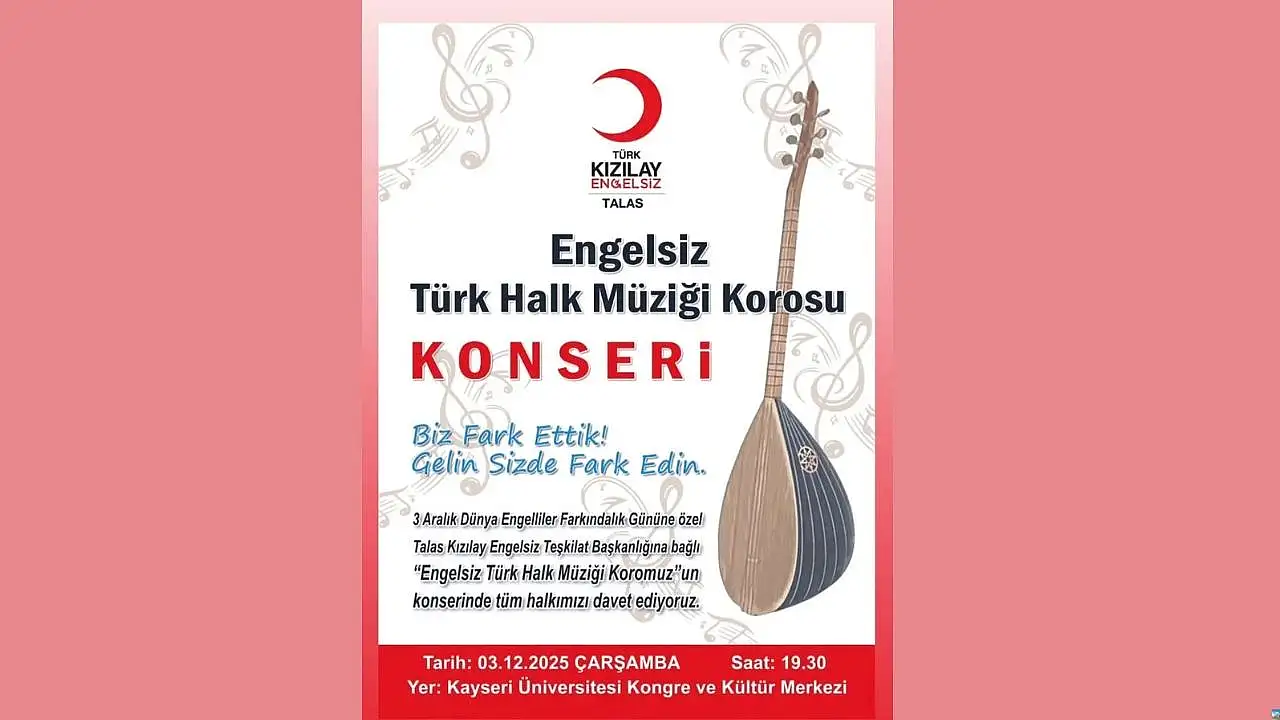 Kayseri, 3 Aralık Dünya Engelliler Günü’nde sıra dışı bir etkinliğe ev sahipliği yapmaya hazırlanıyor. Talas Kızılay Engelsiz Teşkilatı tarafından oluşturulan ‘‘Engelsiz Türk Halk Müziği Korosu’‘, bu özel günde sahneye çıkarak hem müzik dolu bir akşam sunacak hem de güçlü bir farkındalık mesajı verecek.