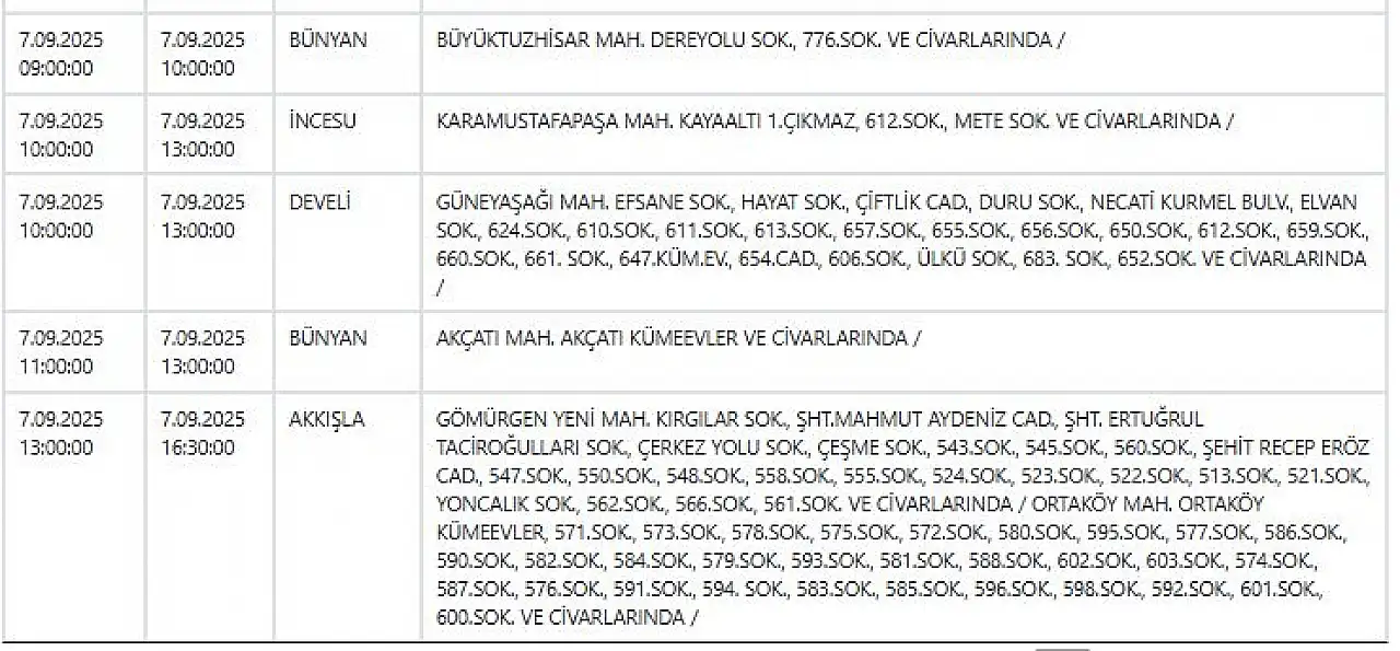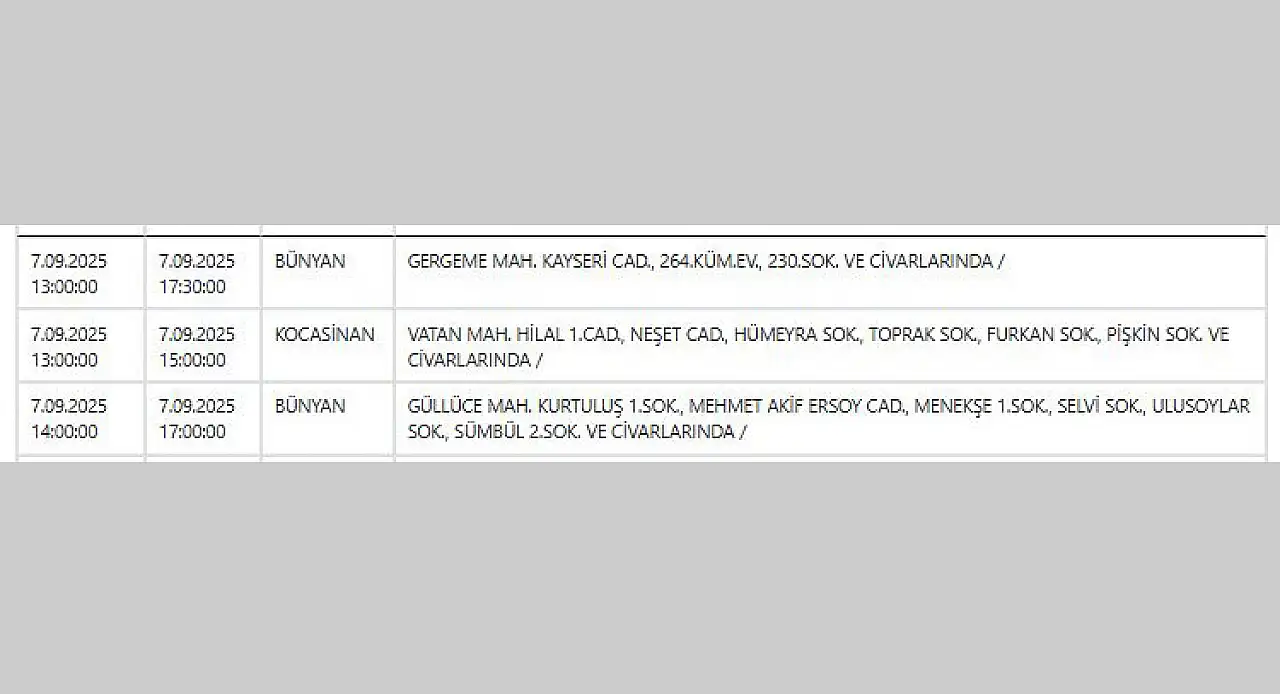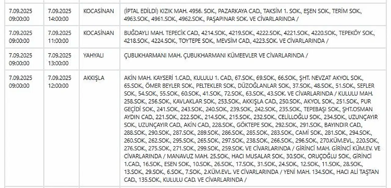 KCETAŞ’tan edinilen bilgilere göre yarın (7 Eylül 2025) aşağıdaki mahallelerde elektrik kesintisi yaşanacak.