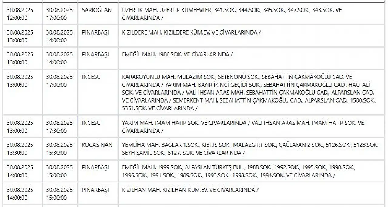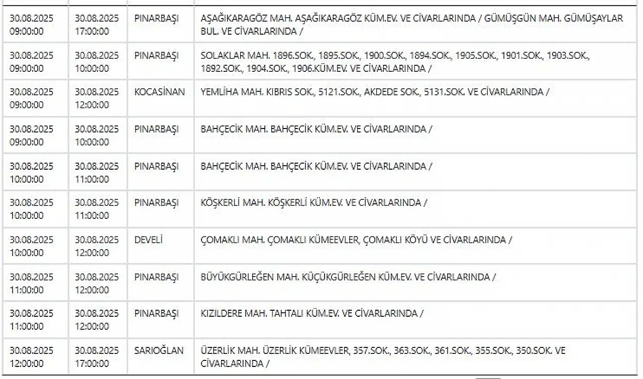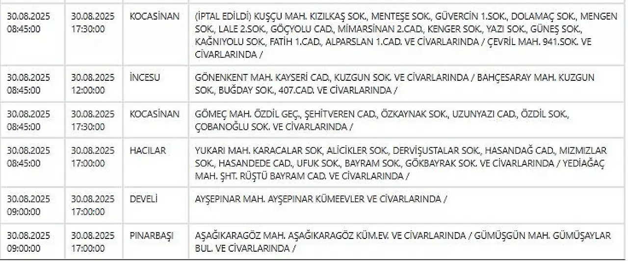 Kayseri'de 30 Ağustos'ta elektrik kesintisi olacak mı? İşte güncel liste...