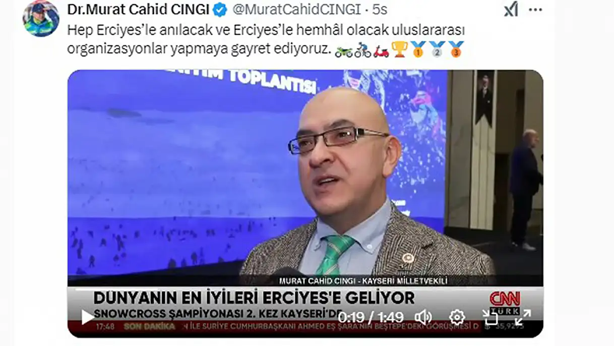 AK Parti Kayseri Milletvekili Murat Cahid Cıngı Cnn Türk'te Sonwcross Şampiyonası ile ilgili açıklamalarda bulundu. Cıngı, ‘Hep Erciyes’le anılacak ve Erciyes’le hemhâl olacak uluslararası organizasyonlar yapmaya gayret ediyoruz’ dedi.