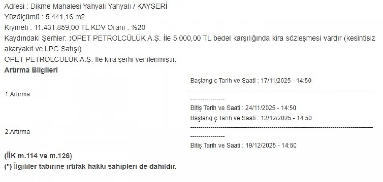Kayseri’nin Yahyalı ilçesinde bir borç nedeniyle icradan satışına karar verilen taşınmazlar, açık artırma yöntemiyle yeni sahibini bulacak. İlangov’da yer alan ilana göre ilçede bulunan akaryakıt, LPG istasyonu 17 Kasım 2025 tarihinde satışa çıkarılıyor. Peki taşınmazların satış fiyatı ne kadar?