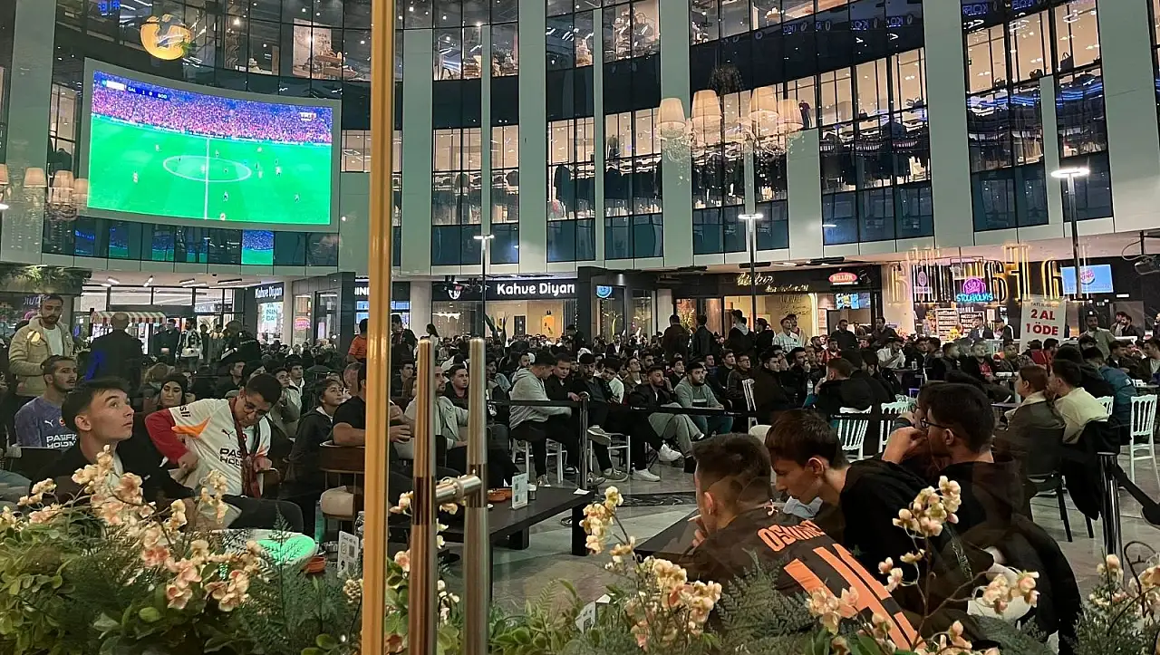 Alışveriş merkezinde zemin kattaki restoran bölümünde yer alan boşluk adeta tribüne dönüştü. Sandalyesini alan taraftarlar alanda yoğunluk oluştururken kafelerde oturan seyirciler de dev ekrandan maçı takip edebilmek için dış taraflara oturdu.