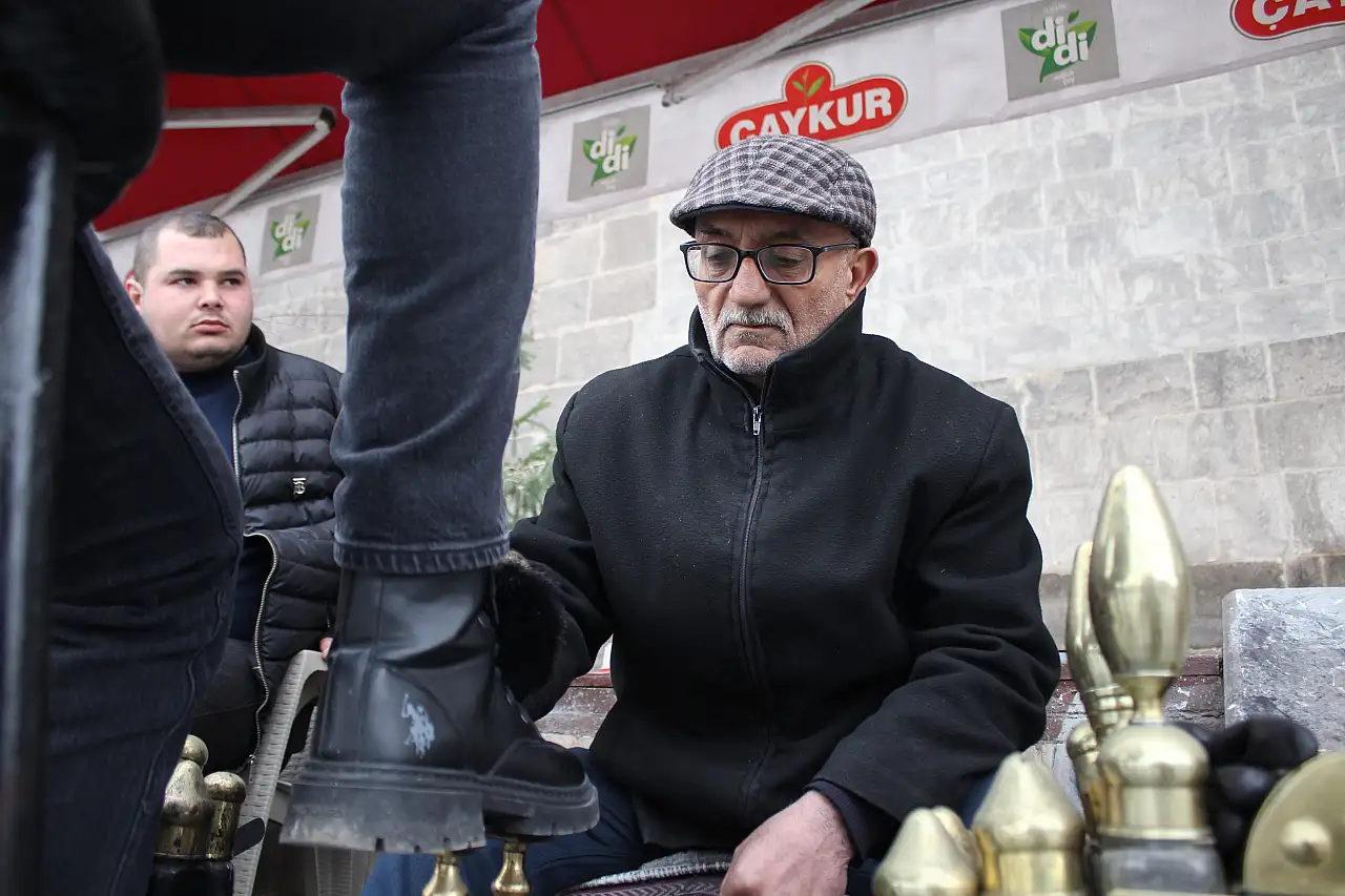Kayseri'de 66 yaşındaki Adem Kahraman, babasından öğrendiği ayakkabı boyacılığını Cumhuriyet Meydanı'nda yaklaşık 35 yıldır sürdürerek geçimini sağlıyor.