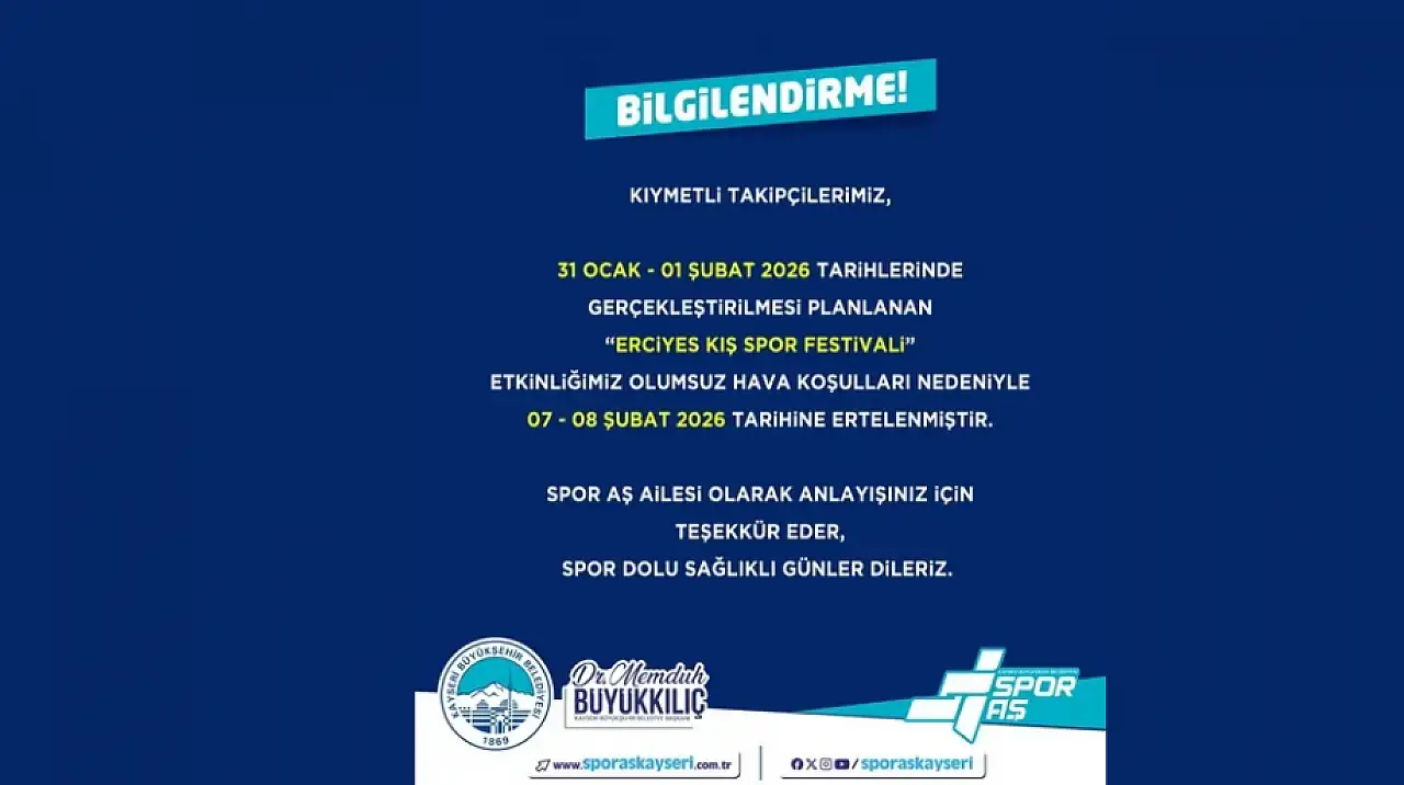 Erciyes Kış Spor Festivali, 31 Ocak Cumartesi ve 1 Şubat Pazar günleri Erciyes Kayak Merkezi Tekir Kapı’da gerçekleştirilecekti. Beklenen olumsuz hava koşulları nedeniyle program ertelendi.