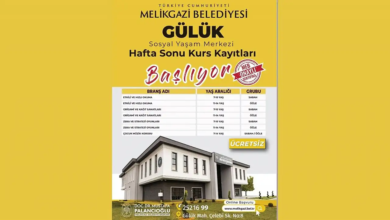 Kursların sabah ve öğle saatlerinde yapılacağı ifade edildi. Ücretsiz olan kursların kayıtları için www.melikgazi.bel.tr adresinden başvuru yapabilirsiniz.