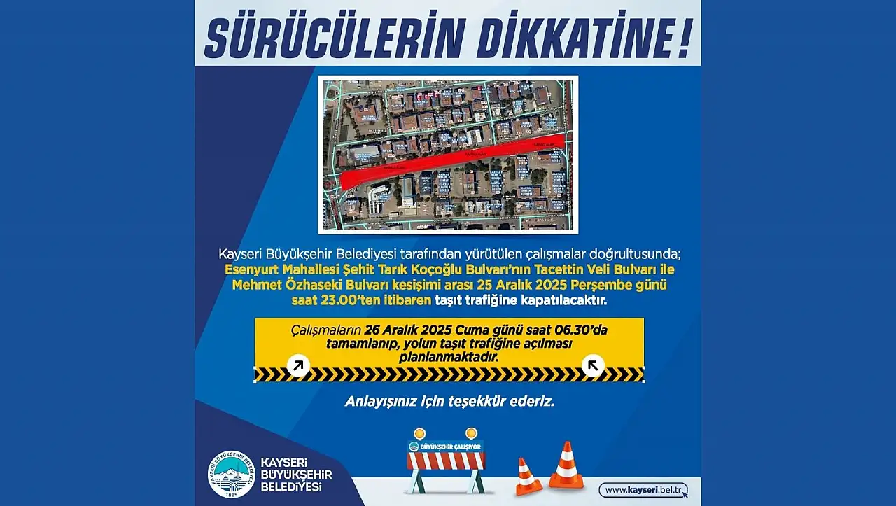 Şehir içi ulaşımın daha güvenli ve konforlu hale gelmesi amacıyla çalışmalarına aralıksız devam eden Kayseri Büyükşehir Belediyesi yaptığı açıklamada, Esenyurt Mahallesi Şehit Tarık Koçoğlu Bulvarı’nın Tacettin Veli Bulvarı ile Mehmet Özhaseki Bulvarı arasındaki kesişiminde yürütülecek çalışmalar nedeniyle, söz konusu güzergahın 25 Aralık 2025 Perşembe günü saat 23.00 itibarıyla geçici olarak taşıt trafiğine kapatılacağını duyurdu.
