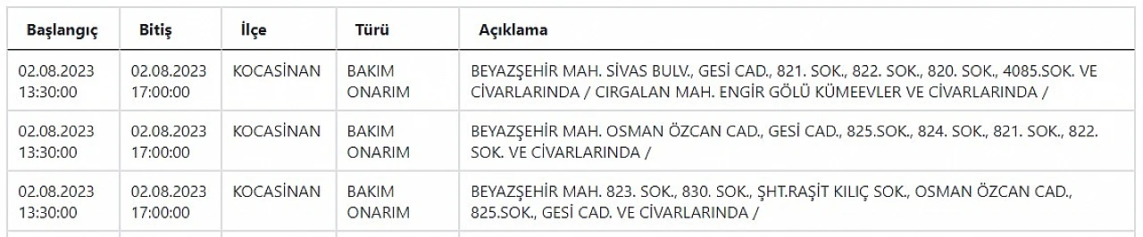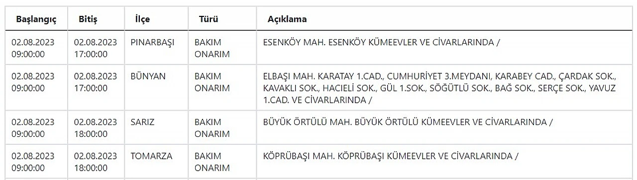KCETAŞ’tan edinilen bilgilere göre bugün (2 Ağustos 2023) aşağıdaki ilçe ve mahallelerde elektrik kesintisi yaşanacak.