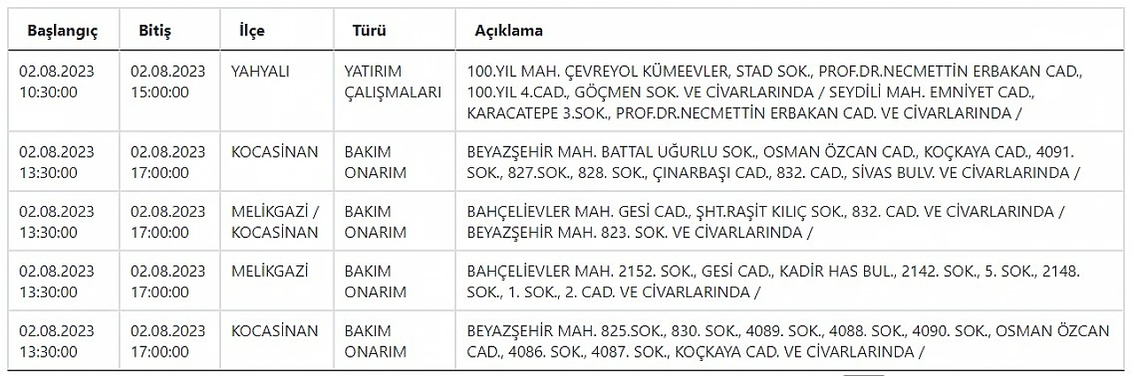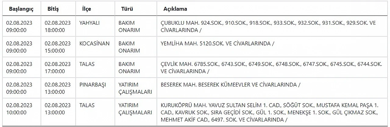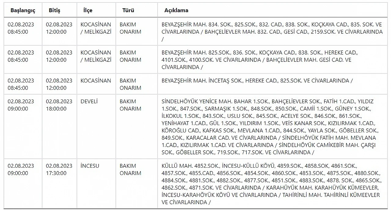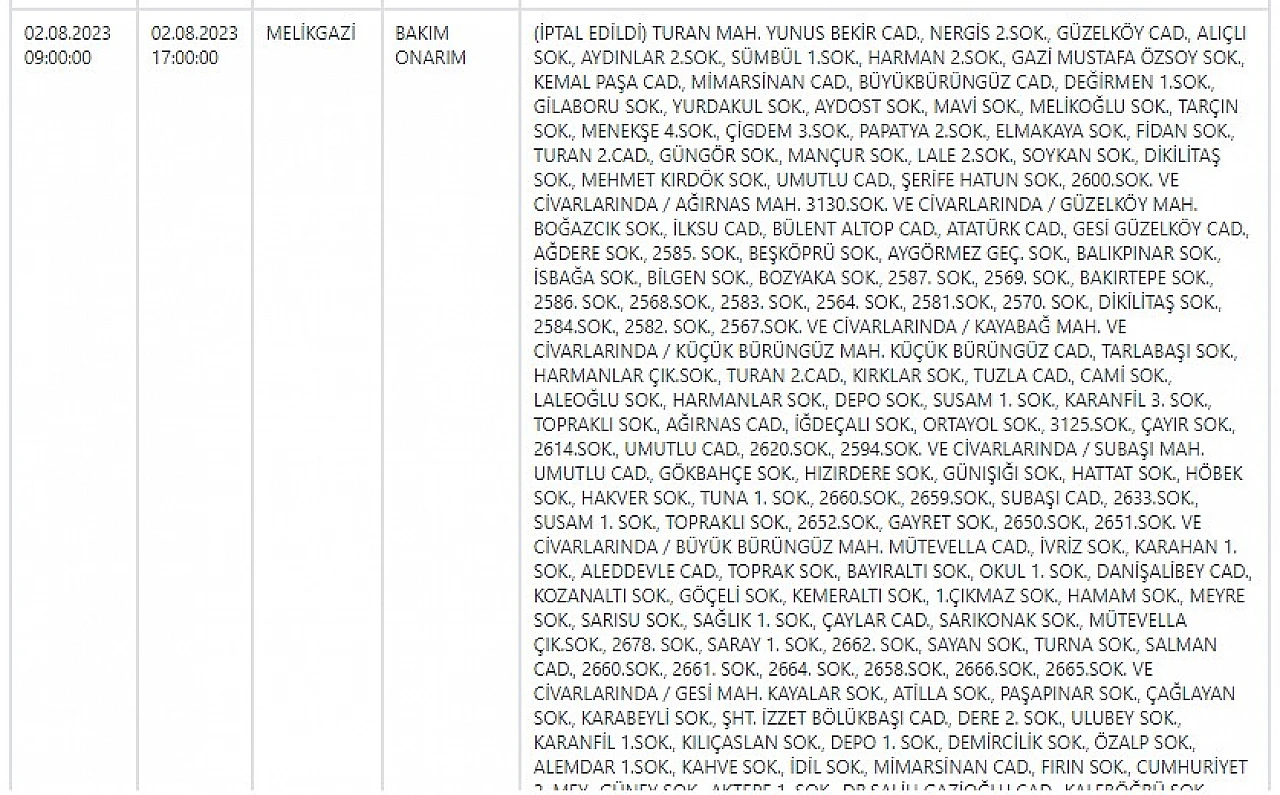 Kayseri'de bugün hangi mahallelerde elektrik kesintisi yaşanacak? – 2 Ağustos 2023
