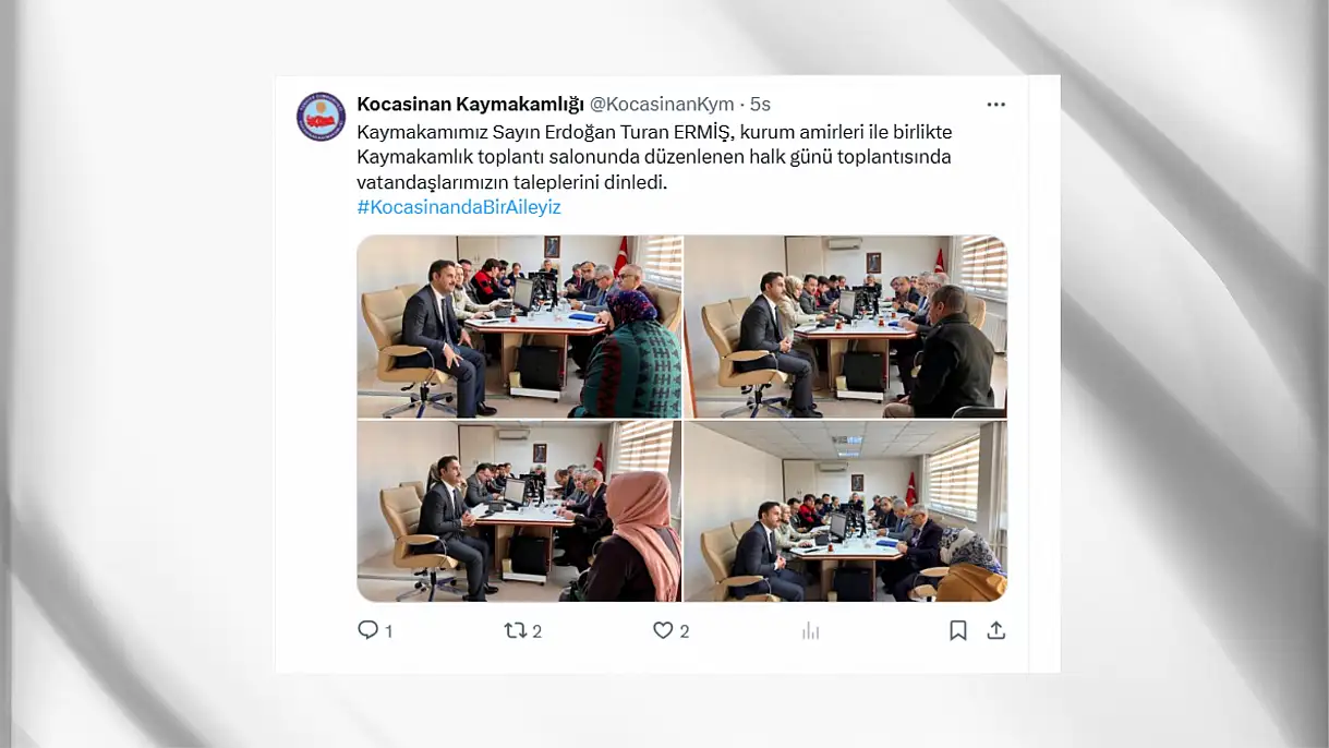 Kocasinan Kaymakamı Erdoğan Turan Ermiş, kurum amirleri ile birlikte Kaymakamlık toplantı salonunda düzenlenen halk günü toplantısında vatandaşların taleplerini dinledi.