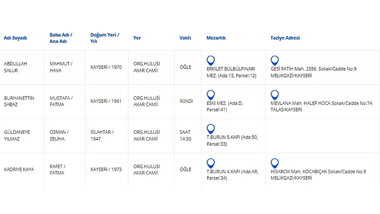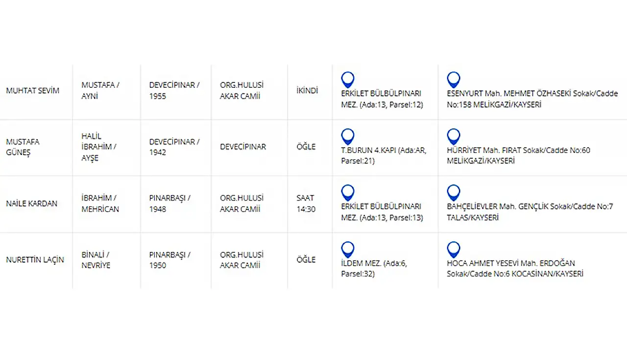 16 Nisan Çarşamba günü vefat edenleri Kayseri Anadolu Haber olarak derledik.