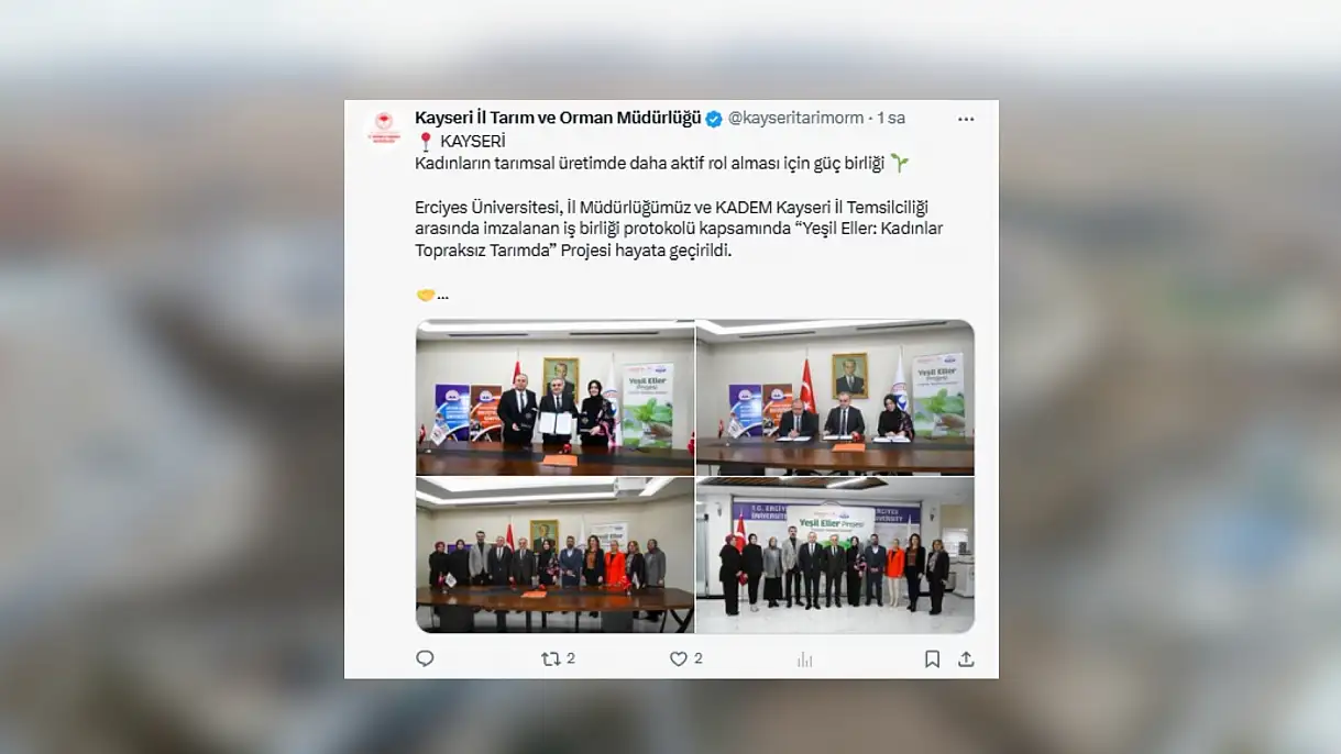 Erciyes Üniversitesi, Kayseri İl Tarım ve Orman Müdürlüğü ve KADEM Kayseri İl Temsilciliği arasında imzalanan iş birliği protokolü kapsamında Yeşil Eller: Kadınlar Topraksız Tarımda Projesi hayata geçirildi.