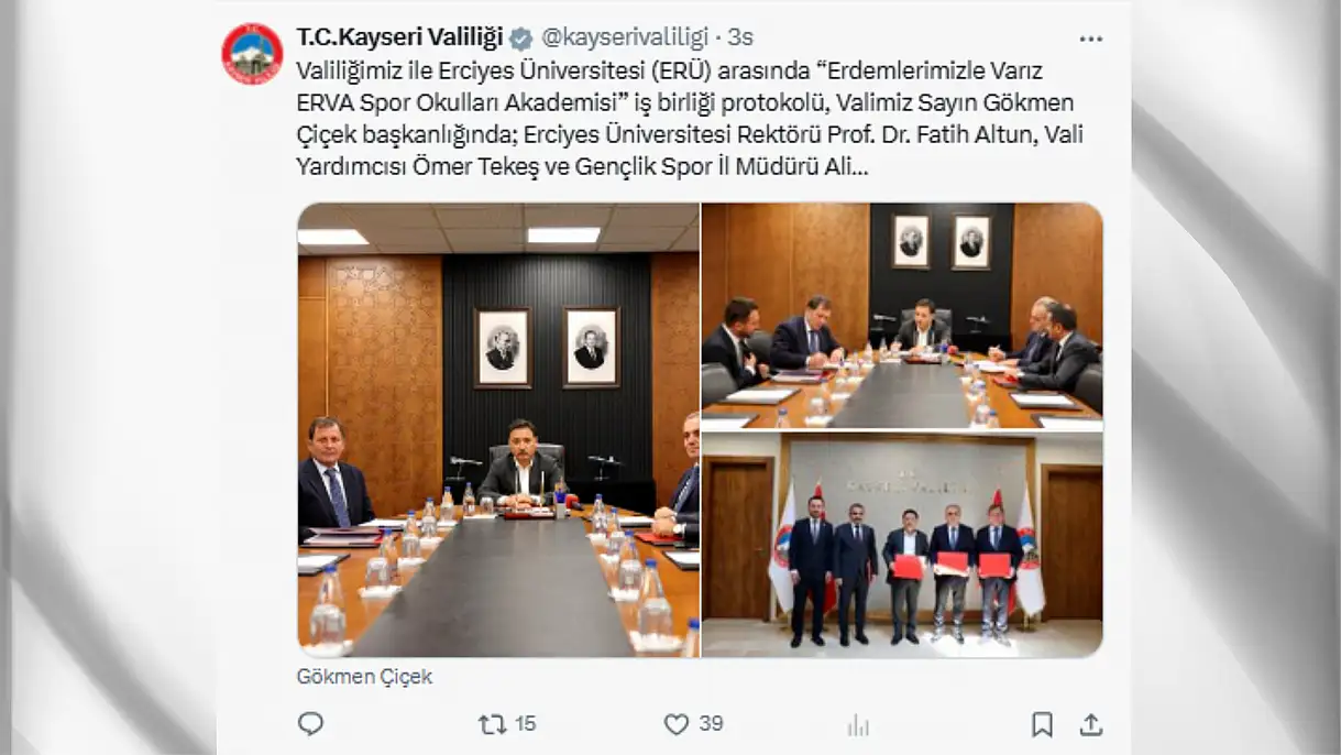 Kayseri Valiliği ile Erciyes Üniversitesi (ERÜ) arasında Erdemlerimizle Varız ERVA Spor Okulları Akademisi iş birliği protokolü, Vali Gökmen Çiçek başkanlığında; Erciyes Üniversitesi Rektörü Prof. Dr. Fatih Altun, Vali Yardımcısı Ömer Tekeş ve Gençlik Spor İl Müdürü Ali İhsan Kabakçı’nın katılımıyla imzalandı.