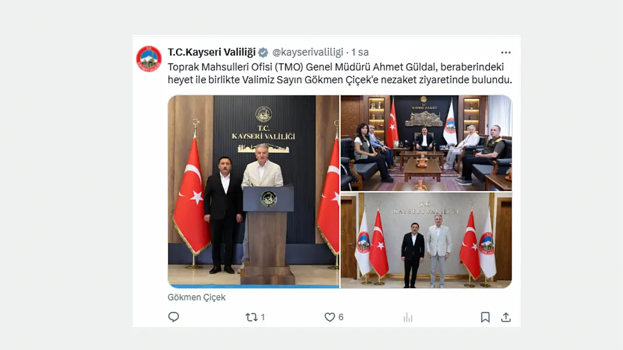 Haberler Güncel Kayseri'de bugün neler paylaşıldı? Sosyal medyada öne çıkan gelişmeler... Kayseri'de bugün neler paylaşıldı? Sosyal medyada öne çıkan gelişmeler... Kayseri'de bugün kamu kurum ve kuruluşları hangi paylaşımları yaptı. Sosyal medyada neler konuşuldu. Detaylar Kayseri Anadolu Haber'de... sosyal medya PAYLAŞ 14.08.2025 16:42 Güncelleme: 14.08.2025 16:42 Muhammed KösedağMuhabir TAKİP ET 5 6 PAYLAŞ Toprak Mahsulleri Ofisi (TMO) Genel Müdürü Ahmet Güldal, beraberindeki heyet ile birlikte Vali Gökmen Çiçek'e nezaket ziyaretinde bulundu.
