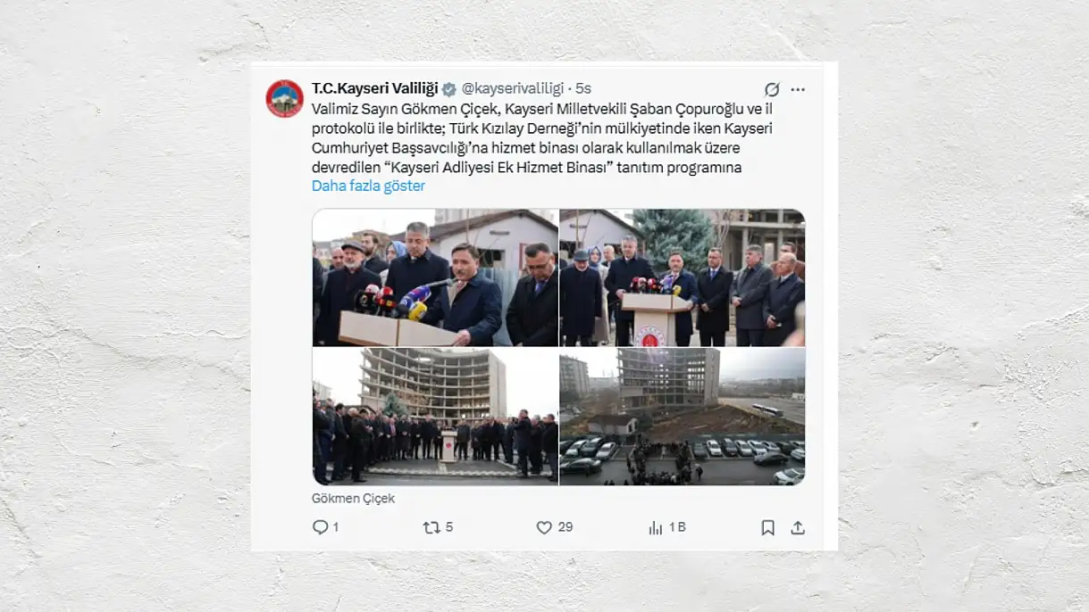 Kayseri Valilsi Gökmen Çiçek, Kayseri Milletvekili Şaban Çopuroğlu ve il protokolü ile birlikte; Türk Kızılay Derneği’nin mülkiyetinde iken Kayseri Cumhuriyet Başsavcılığı’na hizmet binası olarak kullanılmak üzere devredilen Kayseri Adliyesi Ek Hizmet Binası tanıtım programına katıldı.