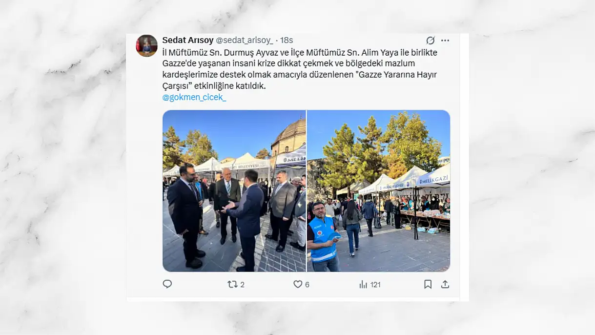 Melikgazi Kaymakamı Sedat Arısoy İl Müftüsü Durmuş Ayvaz ve İlçe Müftüsü. Alim Yaya ile birlikte Gazze'de yaşanan insani krize dikkat çekmek ve bölgedeki mazlum kardeşlerimize destek olmak amacıyla düzenlenen Gazze Yararına Hayır Çarşısı etkinliğine katıldı.