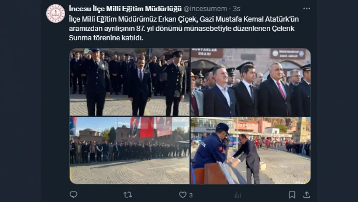 'İlçe Milli Eğitim Müdürümüz Erkan Çiçek, Gazi Mustafa Kemal Atatürk'ün aramızdan ayrılışının 87. yıl dönümü münasebetiyle düzenlenen Çelenk Sunma törenine katıldı.'