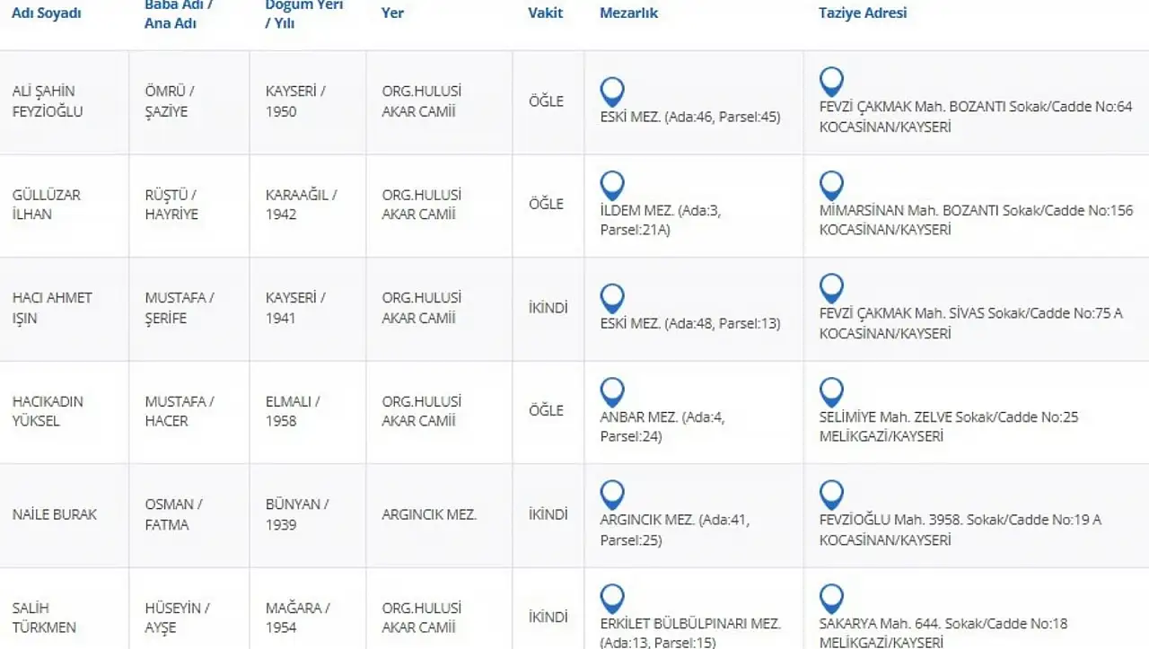 Kayseri Büyükşehir Belediyesi Kayseri'de vefat edenleri her gün sitesinde yayınlıyor. Kayseri'de vefat edenleri uğurlamak için son görevleri bugün yerine getirilecek.