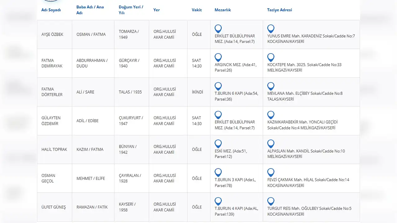 Kayseri Büyükşehir Belediyesi Kayseri'de vefat edenleri her gün sitesinde yayınlıyor. Kayseri'de vefat edenleri uğurlamak için bugün son görevleri bugün yerine getirilecek.