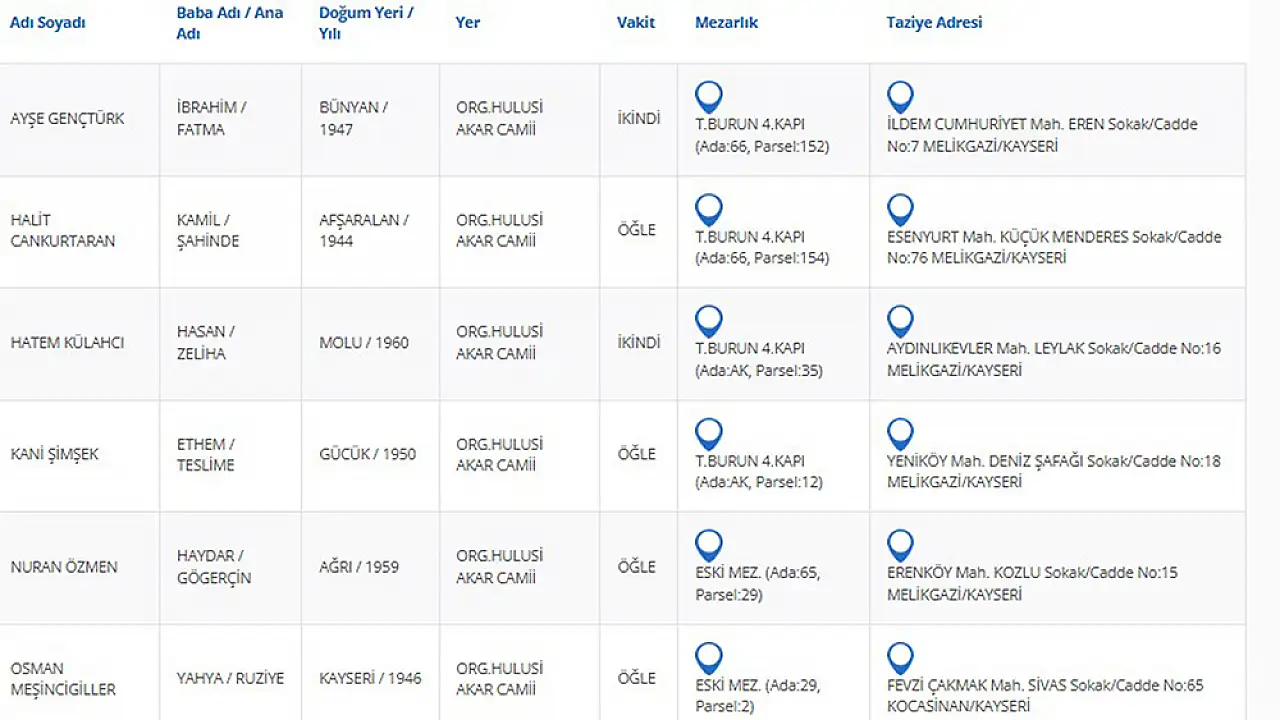 18 Mart Salı günü vefat edenleri Kayseri Anadolu Haber olarak derledik.