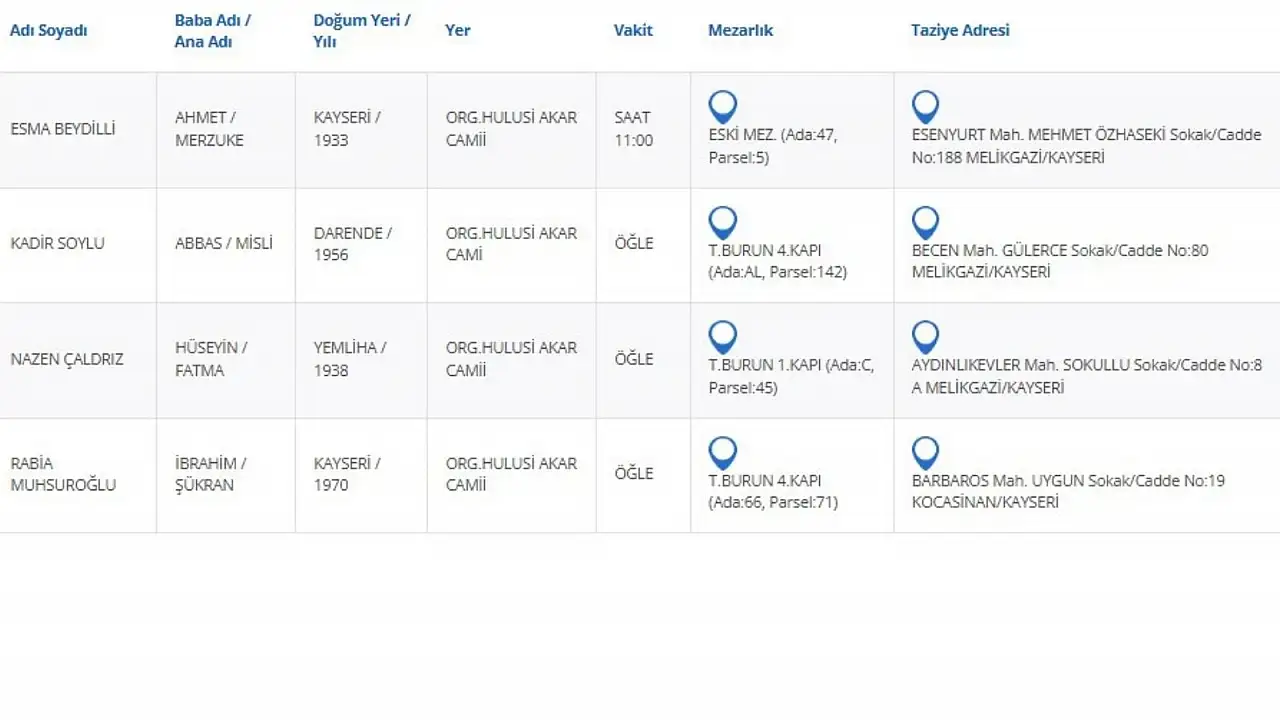 Kayseri Büyükşehir Belediyesi Kayseri'de vefat edenleri her gün sitesinde yayınlıyor. Kayseri'de vefat edenleri uğurlamak için son görevleri bugün yerine getirilecek.