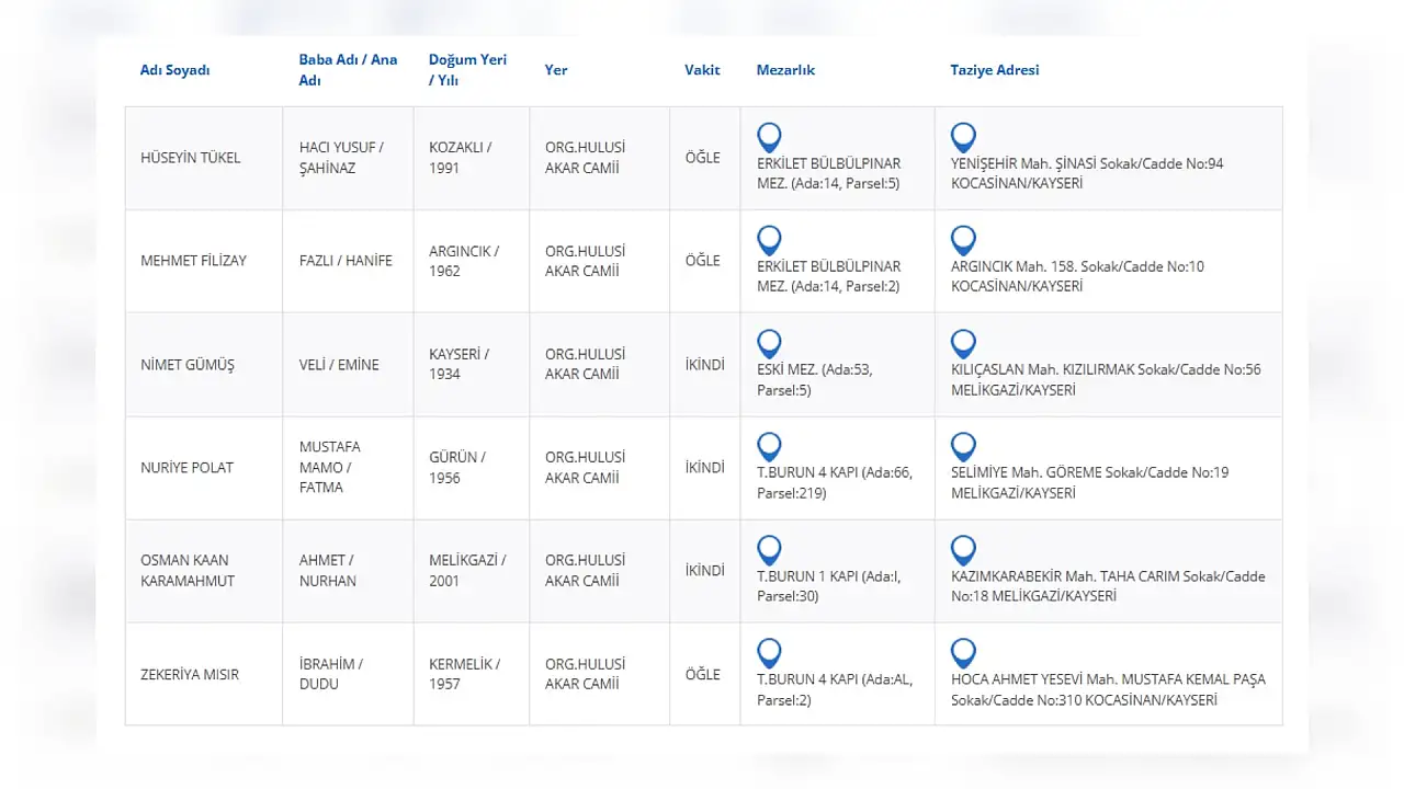 Kayseri Büyükşehir Belediyesi Kayseri'de vefat edenleri her gün sitesinde yayınlıyor. Kayseri'de vefat edenleri uğurlamak için bugün son görevleri bugün yerine getirilecek.
