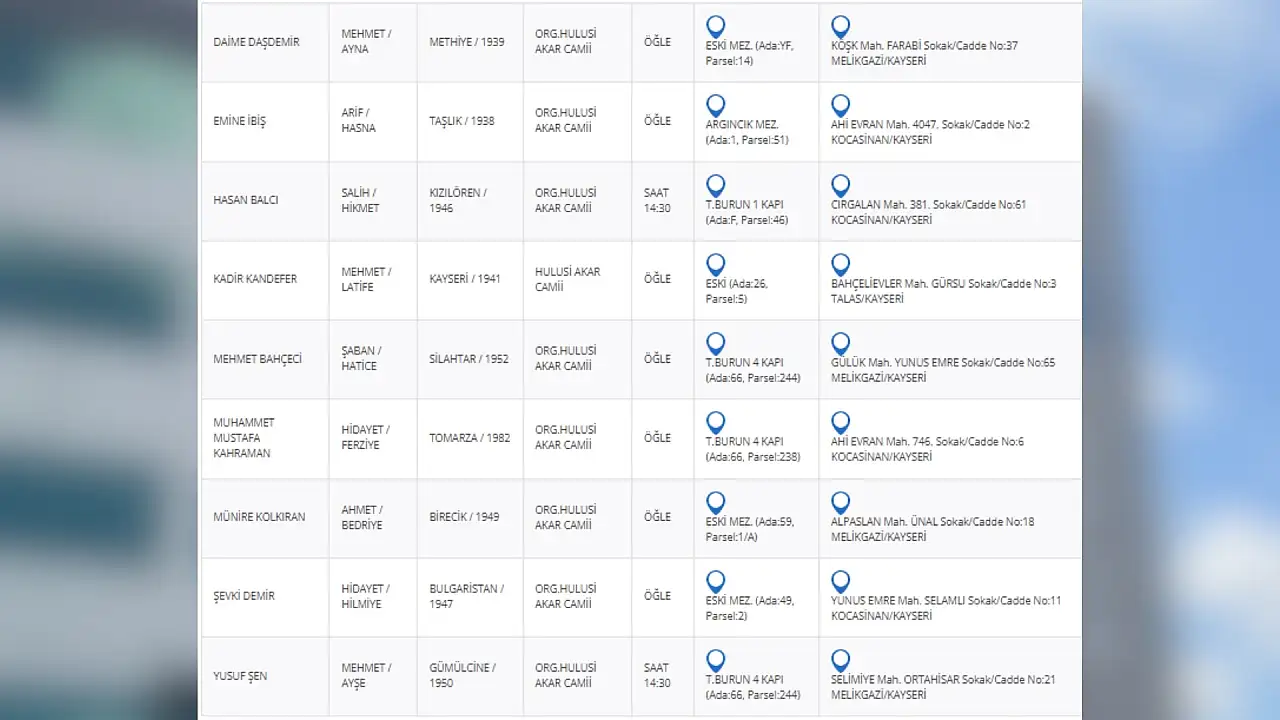 Kayseri Büyükşehir Belediyesi Kayseri'de vefat edenleri her gün sitesinde yayınlıyor. Kayseri'de vefat edenleri uğurlamak için bugün son görevleri bugün yerine getirilecek.
