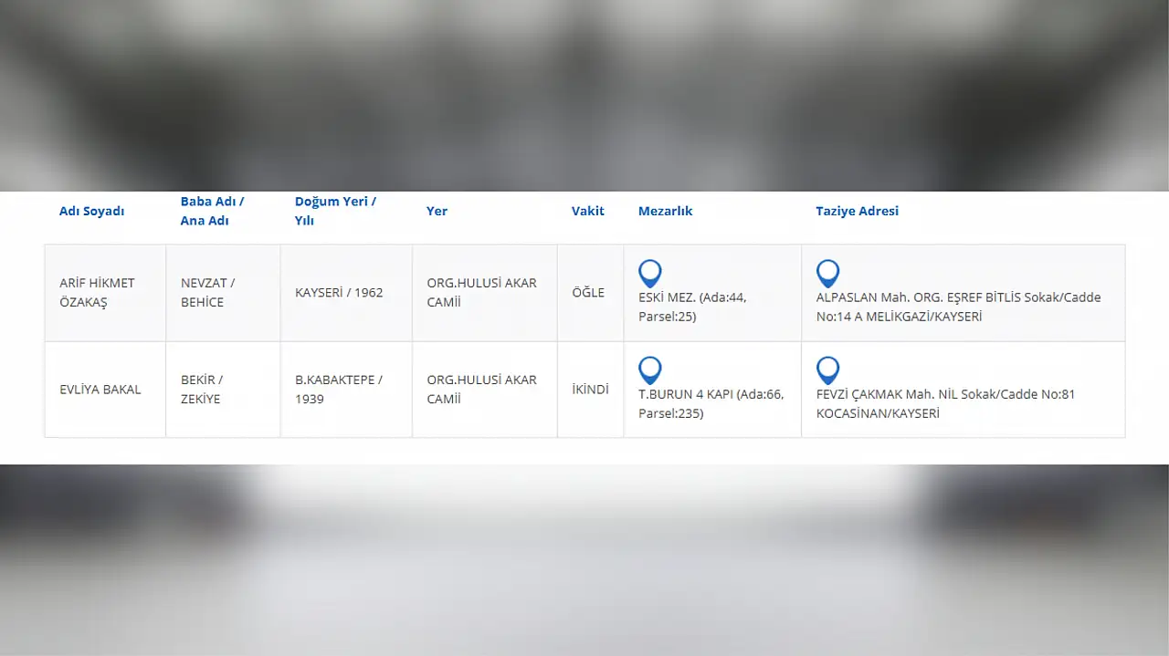 Kayseri Büyükşehir Belediyesi Kayseri'de vefat edenleri her gün sitesinde yayınlıyor. Kayseri'de vefat edenleri uğurlamak için bugün son görevleri bugün yerine getirilecek.