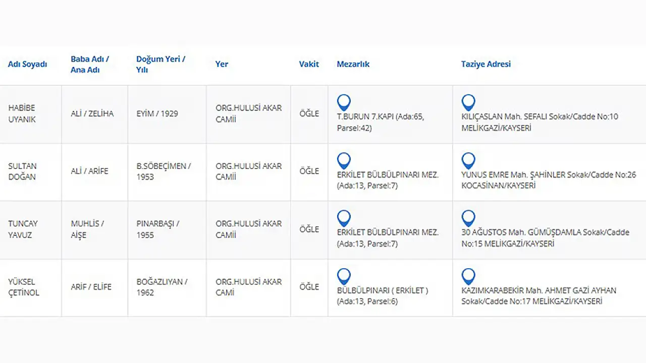 Kayseri Büyükşehir Belediyesi Kayseri'de vefat edenleri her gün sitesinde yayınlıyor. Kayseri'de vefat edenleri uğurlamak için son görevleri bugün yerine getirilecek.