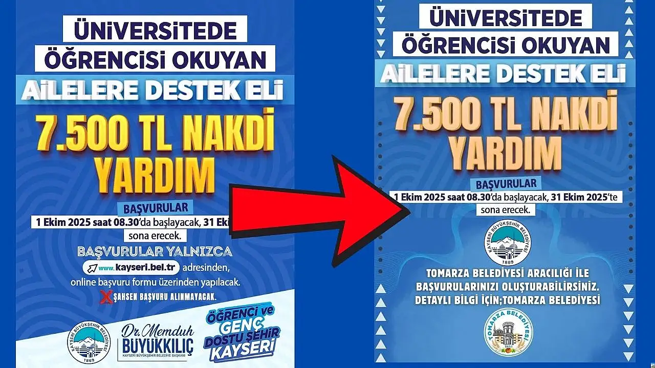 AK Parti Tomarza İlçe Başkanı Turgut Koç, Büyükşehir Belediyesi’nin duyurduğu 7.500 TL’lik eğitim desteğinin, Tomarza Belediyesi tarafından değiştirilerek paylaşılmasına tepki gösterdi. Koç, ‘‘Kayseri Büyükşehir Belediye Başkanımız Memduh Büyükkılıç, başvuruların yalnızca www.kayseri.bel.tr adresinden yapılacağını açıkça duyurdu. Ancak bu kritik uyarı Tomarza Belediyesi’nin paylaştığı görselde silinmiş’‘ dedi.