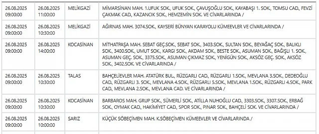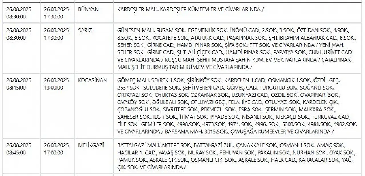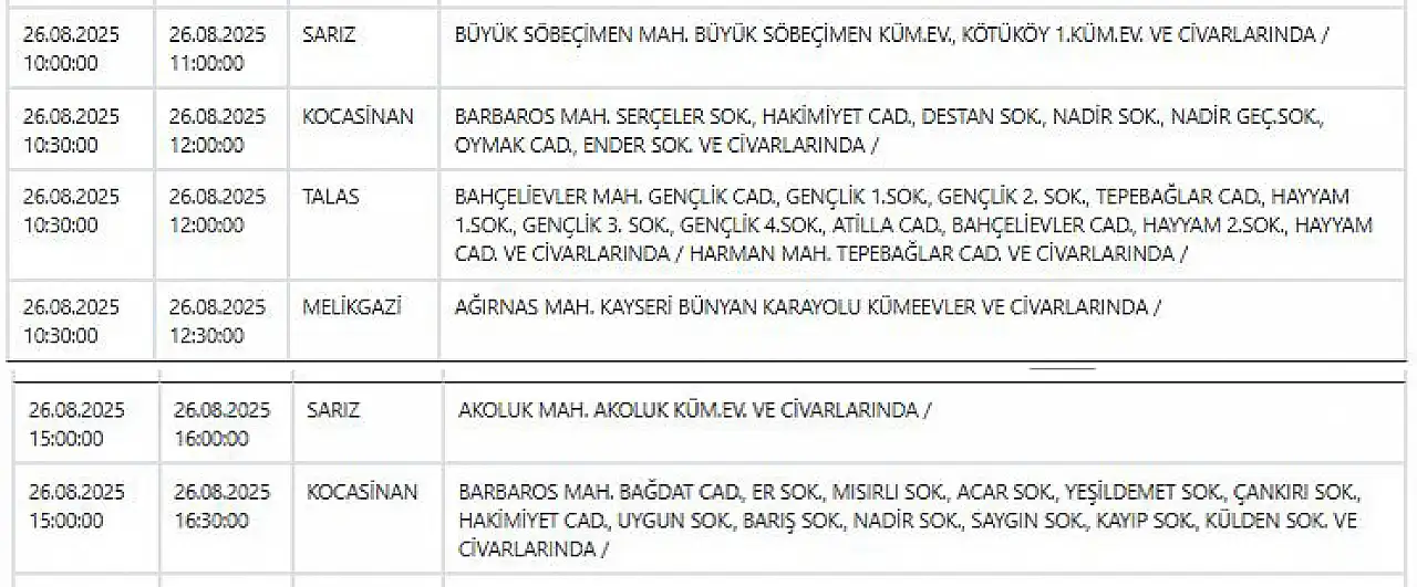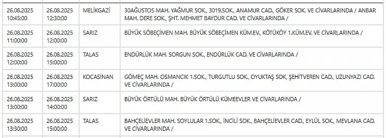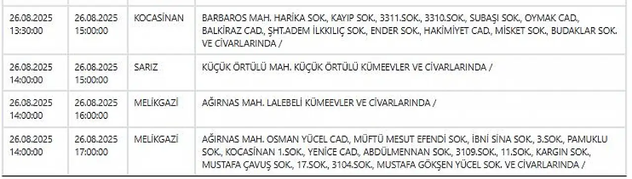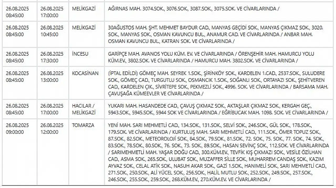 Kayseri'de büyük elektrik kesintisi! Hazırlığınızı yapın… 26 Ağustos 2025