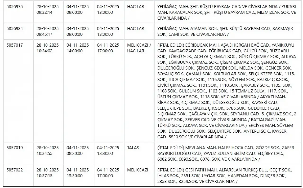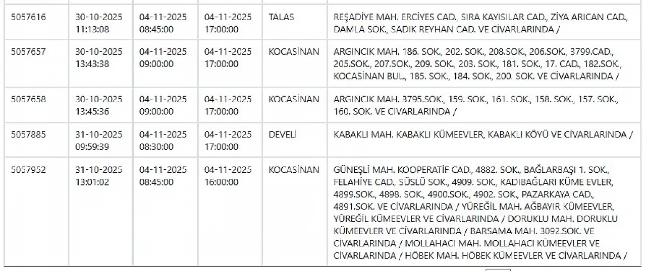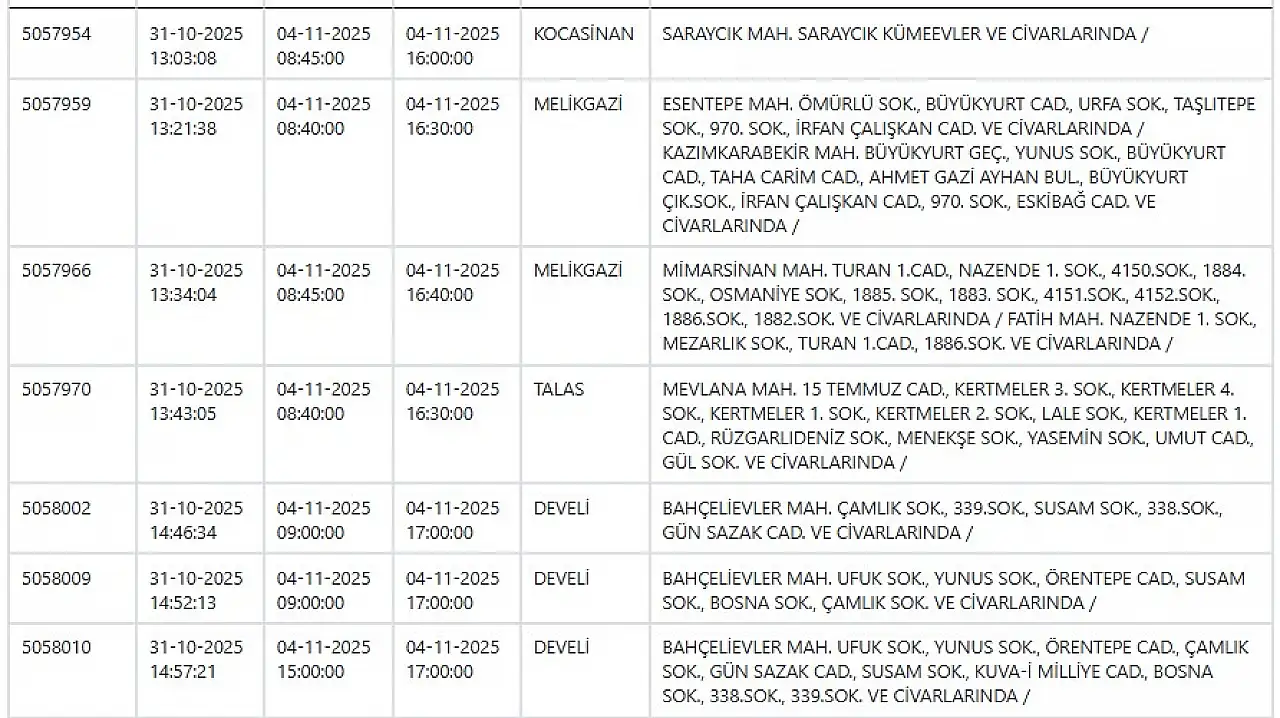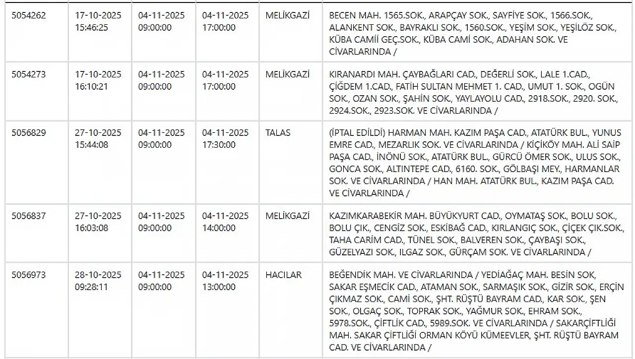 Kayseri'de büyük elektrik kesintisi: İşte tam liste... 4 Kasım 2025