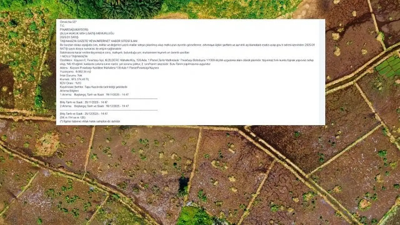 Kayseri’nin Pınarbaşı ilçesinde, Kızıldere Mahallesi sınırlarında bulunan 6 dönüm büyüklüğündeki tarla icra yoluyla satışa çıkarıldı.