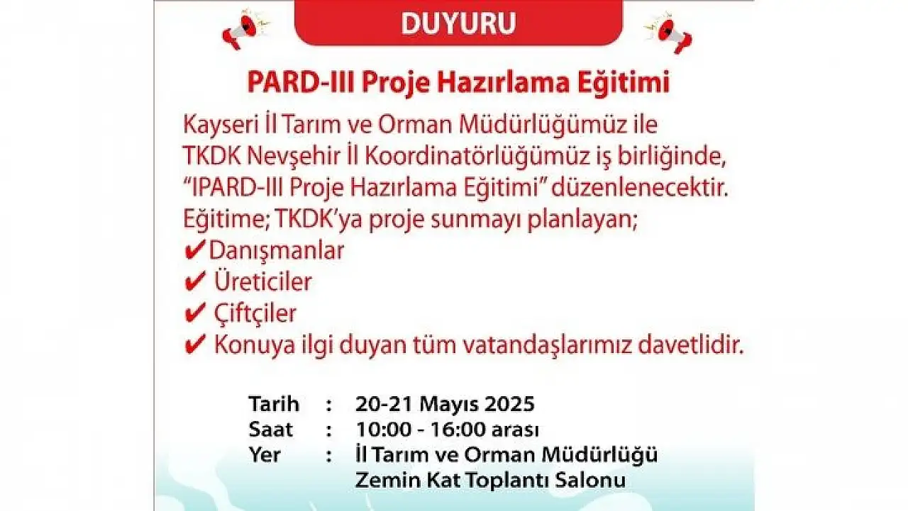 Kayseri İl Tarım ve Orman Müdürlüğü ile TKDK Nevşehir İl Koordinatörlüğü iş birliğinde, IPARD-III programı kapsamında proje hazırlamak isteyen vatandaşlara yönelik eğitim düzenlenecek.