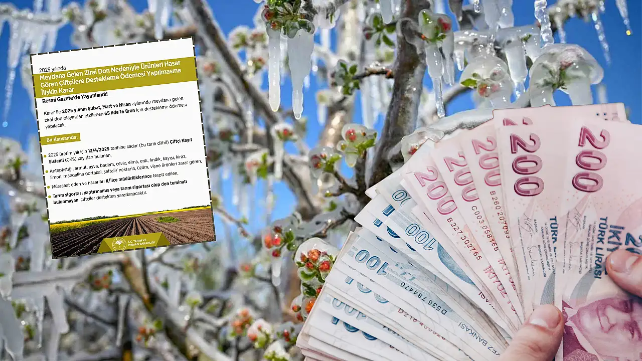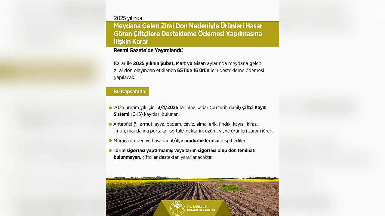 Tarım ve Orman Bakanlığı tarafından yapılan paylaşıma göre ‘’2025 Yılında Meydana Gelen Zirai Don Nedeniyle Ürünleri Hasar Gören Çiftçilere Destekleme Ödemesi Yapılmasına İlişkin Karar'' yürürlüğe girdi.