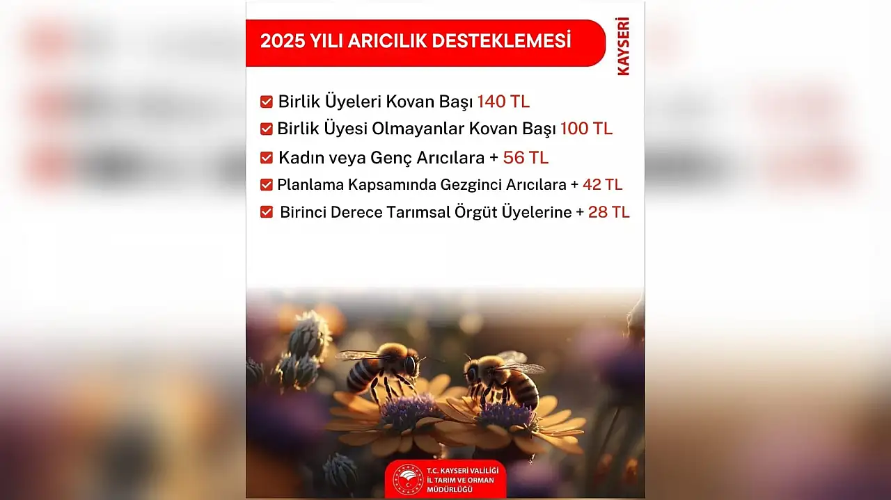 Kayseri’de 2025 yılı arıcılık destekleri açıklandı. T.C. Kayseri Valiliği İl Tarım ve Orman Müdürlüğü’nün duyurusuna göre, birlik üyesi arıcılara kovan başına 140 TL, birlik üyesi olmayanlara ise 100 TL ödeme yapılacak. Kadın veya genç arıcılara ayrıca +56 TL, gezginci arıcılara +42 TL, birinci derece tarımsal örgüt üyelerine ise +28 TL ek katkı sağlanacak.