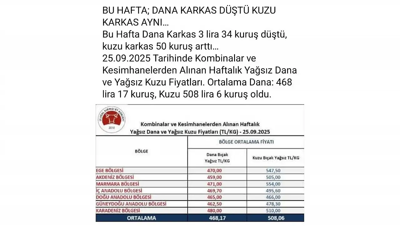 Ulusal Kırmızı Et Konseyi verilerinde 25 Eylül 2025 tarihli güncelleme ile dana karkas fiyatına indirim, kuzu karkas fiyatına ise zam geldi.
