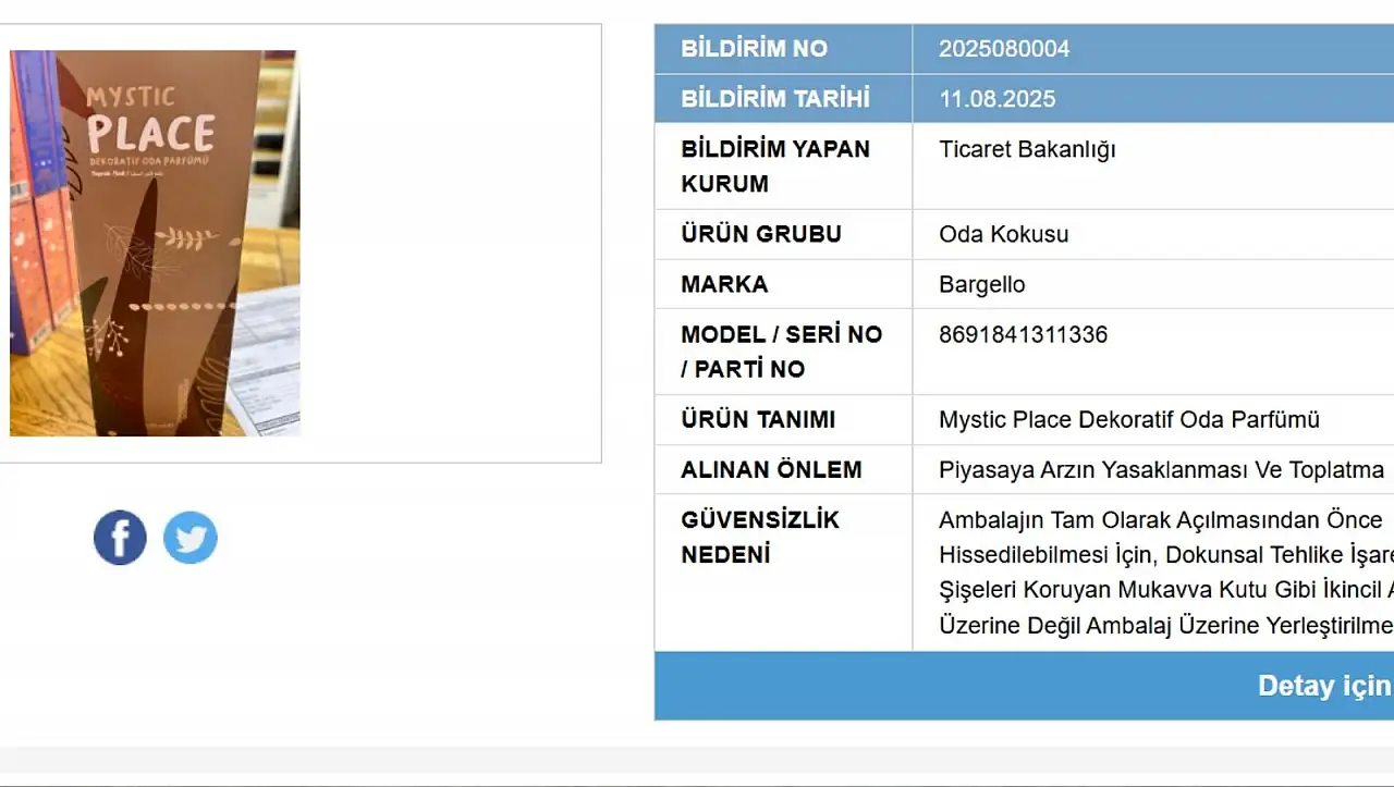 C.C. Kozmetik Kimya İnş. Taah. İth. İhr. San. Ve Tic. Ltd. Şti firmasına ait Bargello Mystic Place 8691841311336 model Dekoratif Oda Parfümü toplatılıyor. Sağlık riski taşıdığı belirtilen ürününün tehlike uyarısının dış kutuya değil, asıl ambalaja konulması gerektiği belirtildi. Güvensiz Ürün Bildirimlerinde yer alan açıklamada şu ifadeler yer aldı, ‘’ Ambalajın Tam Olarak Açılmasından Önce Hissedilebilmesi İçin, Dokunsal Tehlike İşareti, Cam Şişeleri Koruyan Mukavva Kutu Gibi İkincil Ambalajlar Üzerine Değil Ambalaj Üzerine Yerleştirilmelidir.’’
