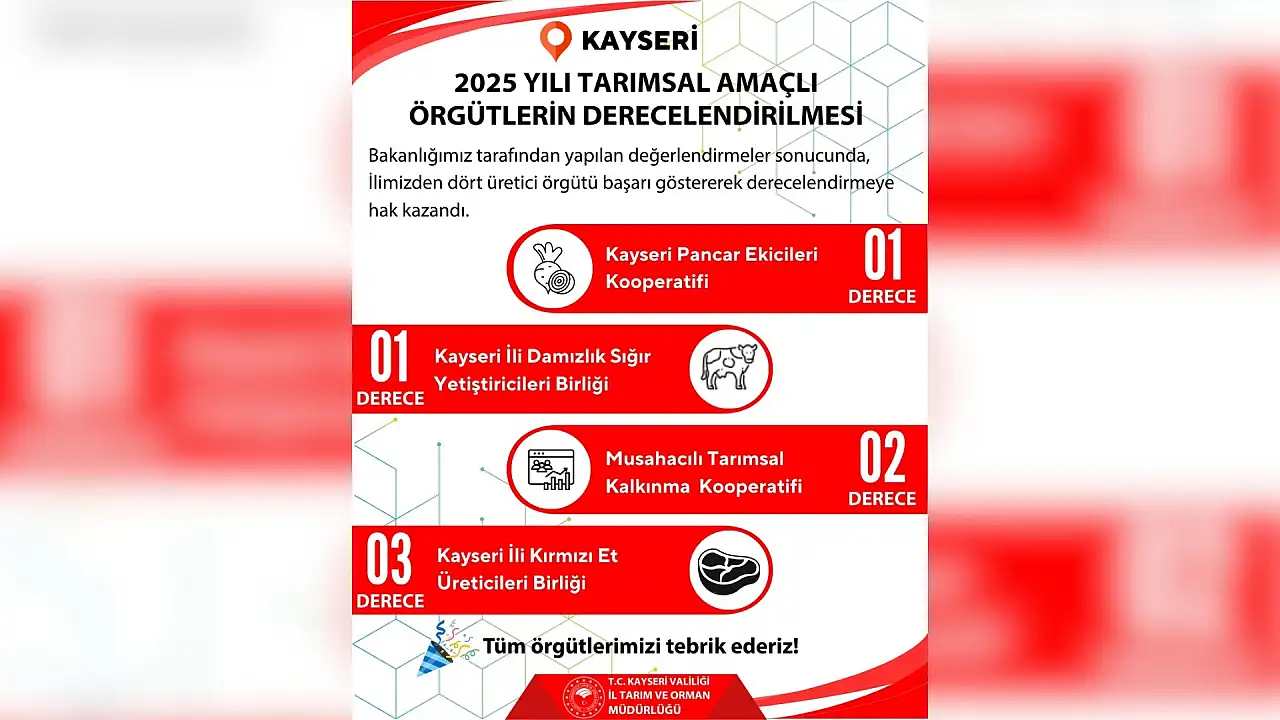 Kayseri İl Tarım ve Orman Müdürlüğü tarafından yapılan paylaşıma göre Tarım ve Orman Bakanlığı tarafından yapılan değerlendirmeler sonucunda Kayseri'de faaliyet gösteren 4 üretici örgütün başarı göstererek derecelendirmeye hak kazandığı belirtildi.