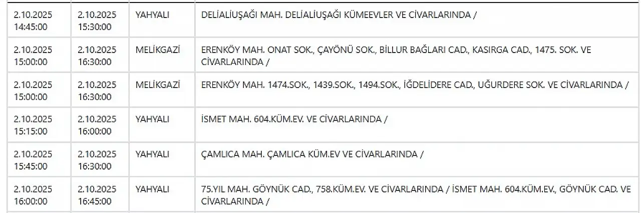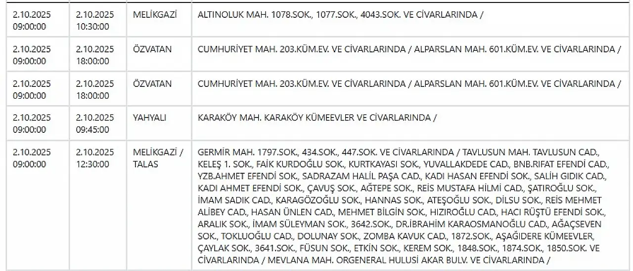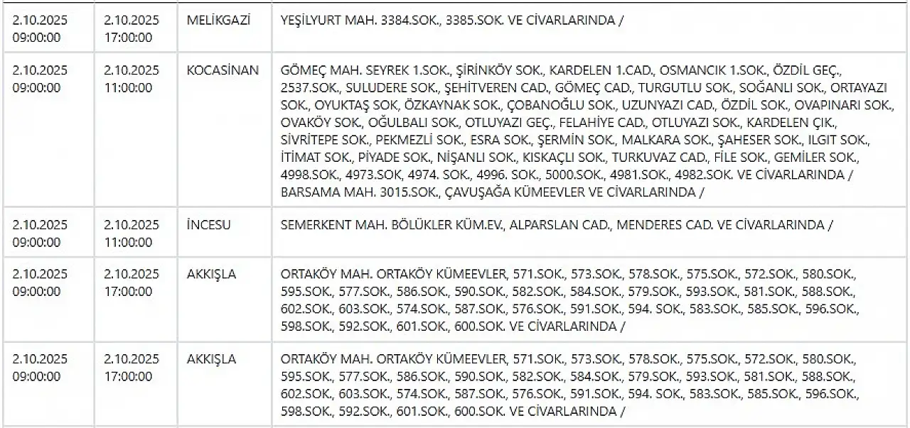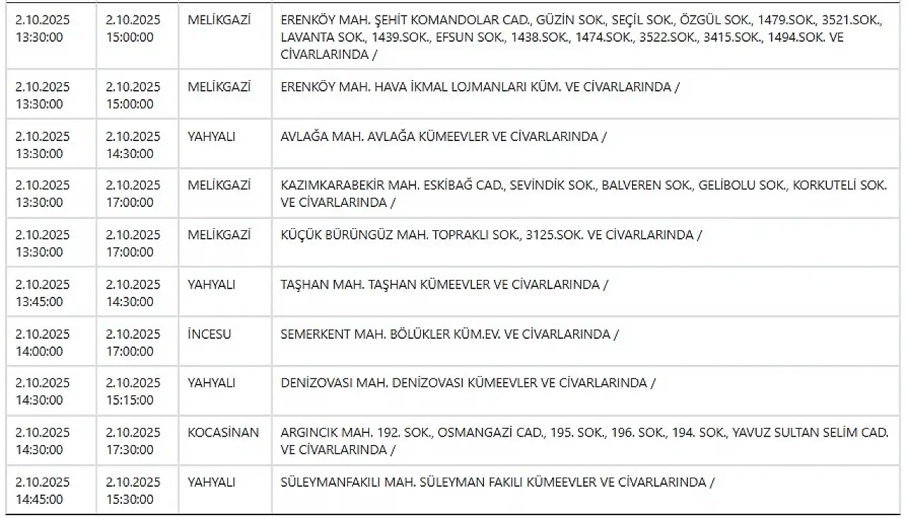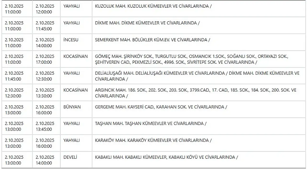Kayseri'de dev elektrik kesintisi: İşte o bölgeler! 2 Ekim 2025
