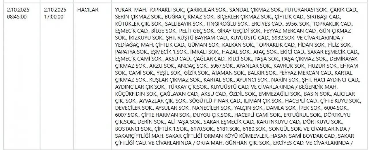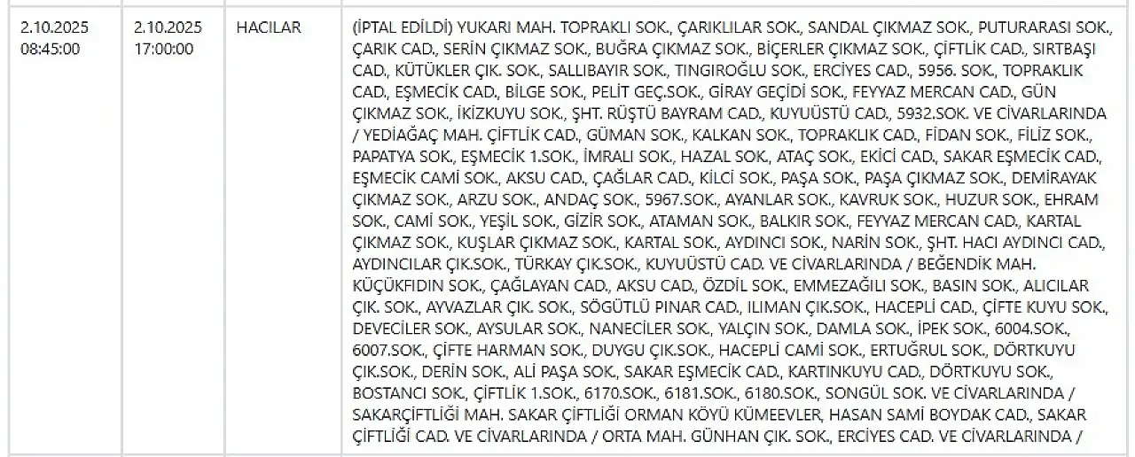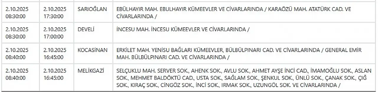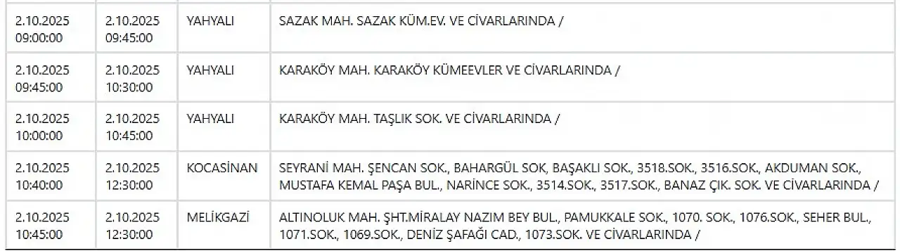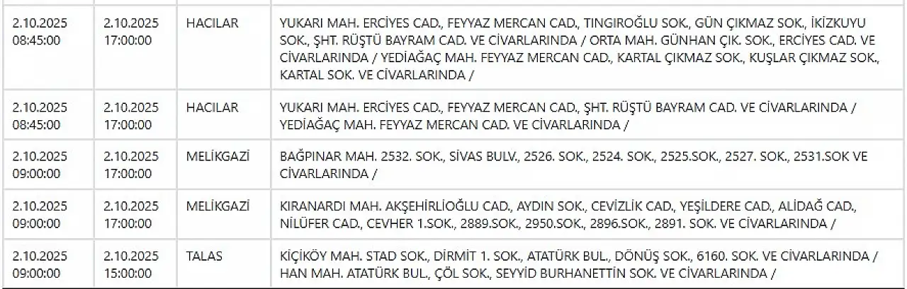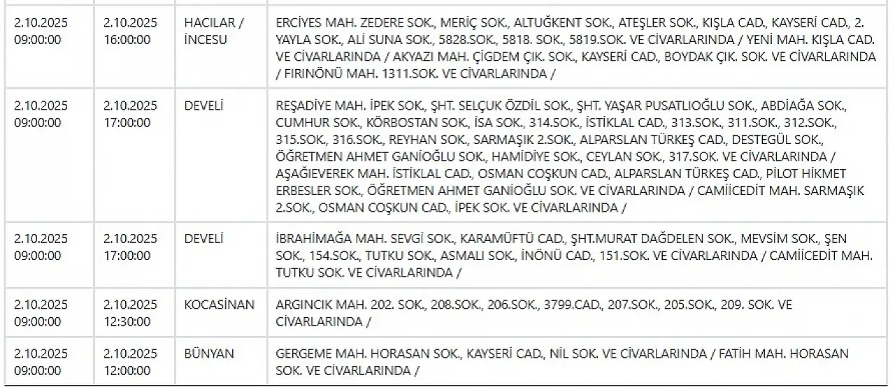 Kayseri'de dev elektrik kesintisi: İşte o bölgeler! 2 Ekim 2025