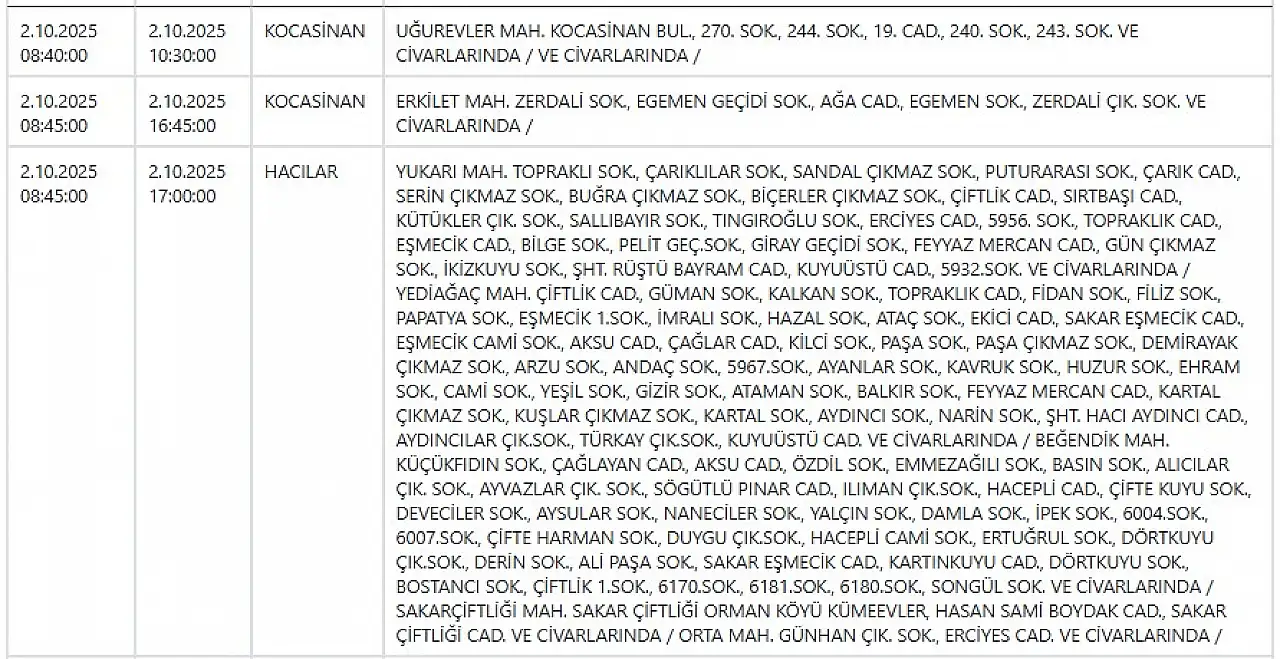 KCETAŞ’tan edinilen bilgilere göre yarın (2 Ekim 2025) aşağıdaki mahallelerde elektrik kesintisi yaşanacak.