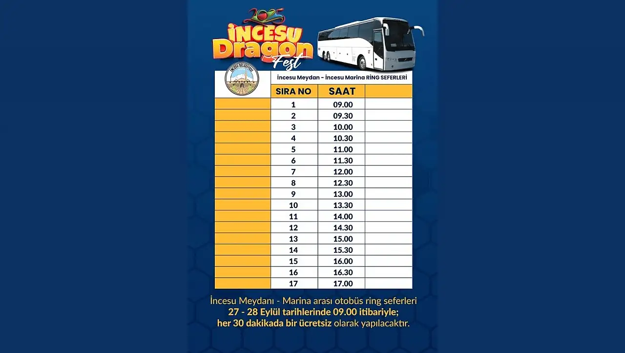İncesu Marina’da düzenlenecek Dragon Festivali 27-28 Eylül 2025 tarihlerinde gerçekleşecek. Su sporları, dans gösterileri ve eğlence dolu etkinlikler için ring sefer saatleri belli oldu. İncesu Belediyesi kamuoyuna duyuru yaptı.