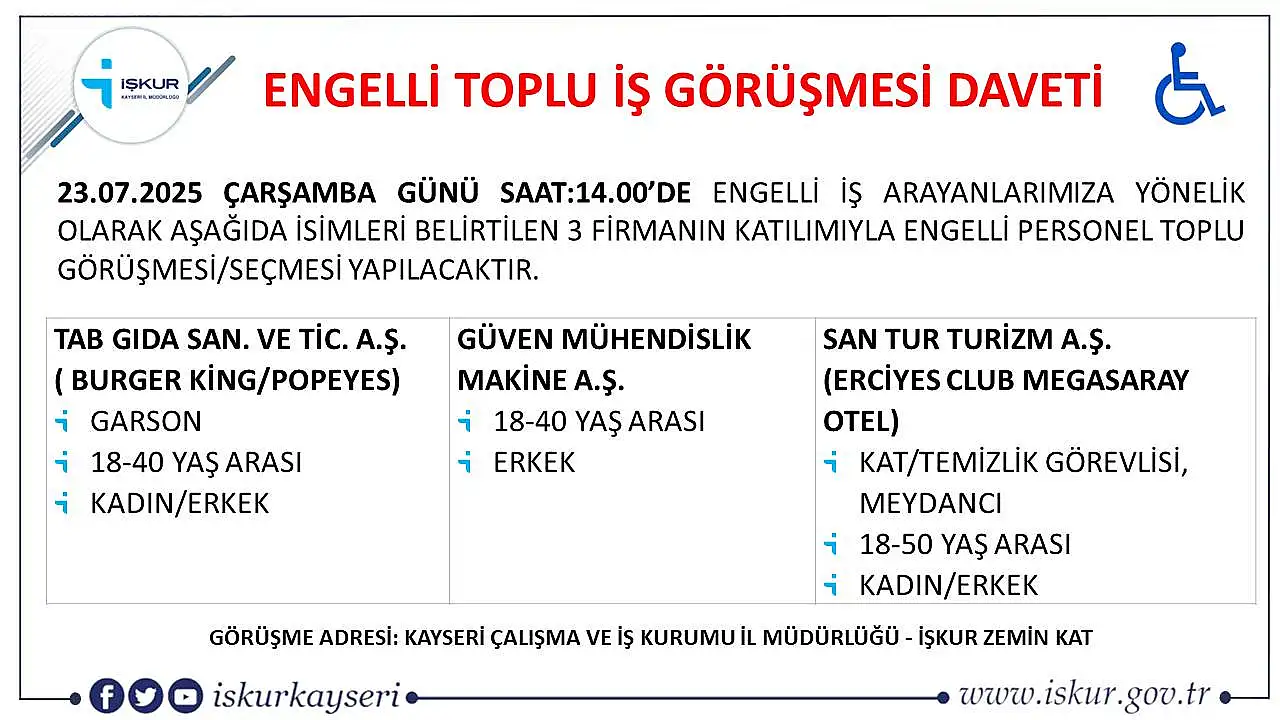 İlgi ilanlara başvuruda bulunmak isteyen engelli vatandaşların 23 Temmuz 2025 tarihinde saat 14:00’da İŞKUR Kayseri İl Müdürlüğü Binası zemin katta bulunan başvuru noktasına başvuru bulunması gerekiyor.