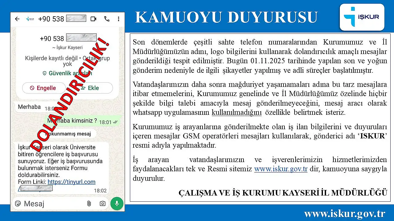 İŞKUR tarafından yapılan açıklamaya göre 1 Kasım 2025 Cumartesi günü yoğun olarak vatandaşlara sahte numaralar üzerinden mesajlar iletildi. . Yapılan açıklamada: ‘’Son dönemlerde çeşitli sahte telefon numaralarından Kurumumuz ve İl Müdürlüğümüzün adını, logo bilgilerini kullanarak dolandırıcılık amaçlı mesajlar gönderildiği tespit edilmiştir. Bugün 01.11.2025 tarihinde yapılan son ve yoğun gönderim nedeniyle de ilgili şikayetler yapılmış ve adli süreçler başlatılmıştır'' denildi.