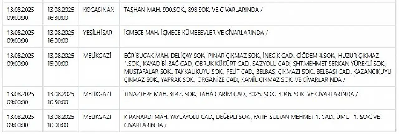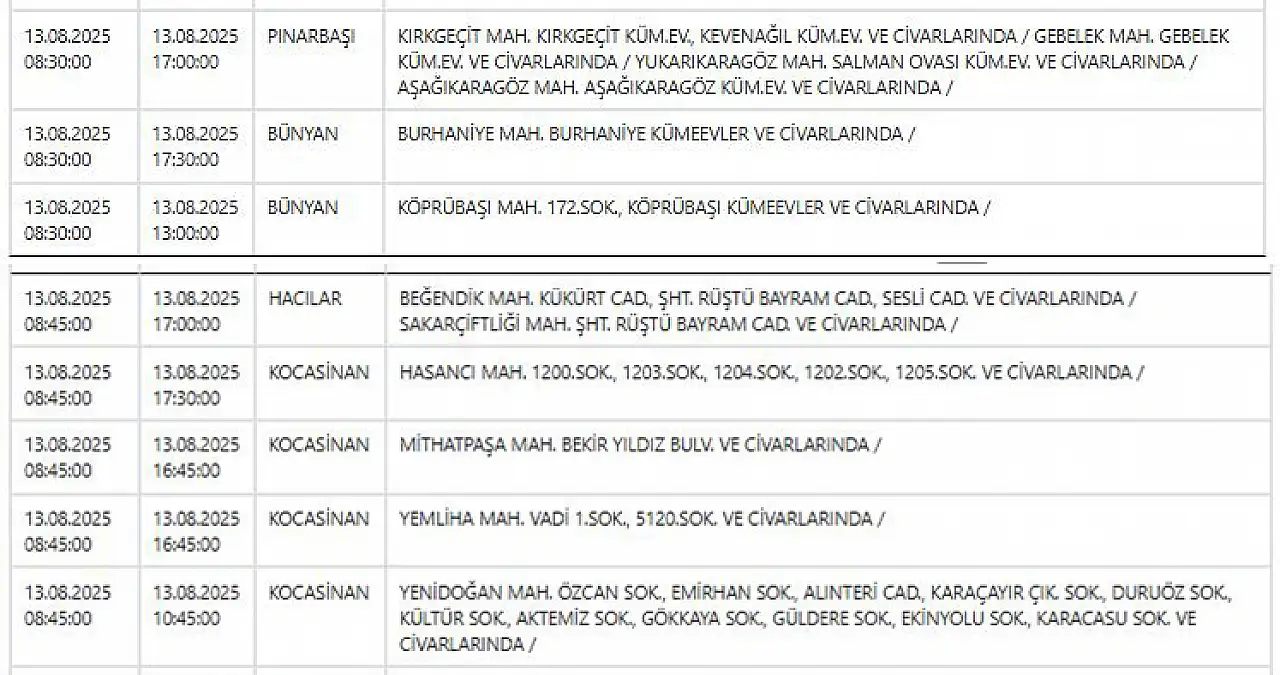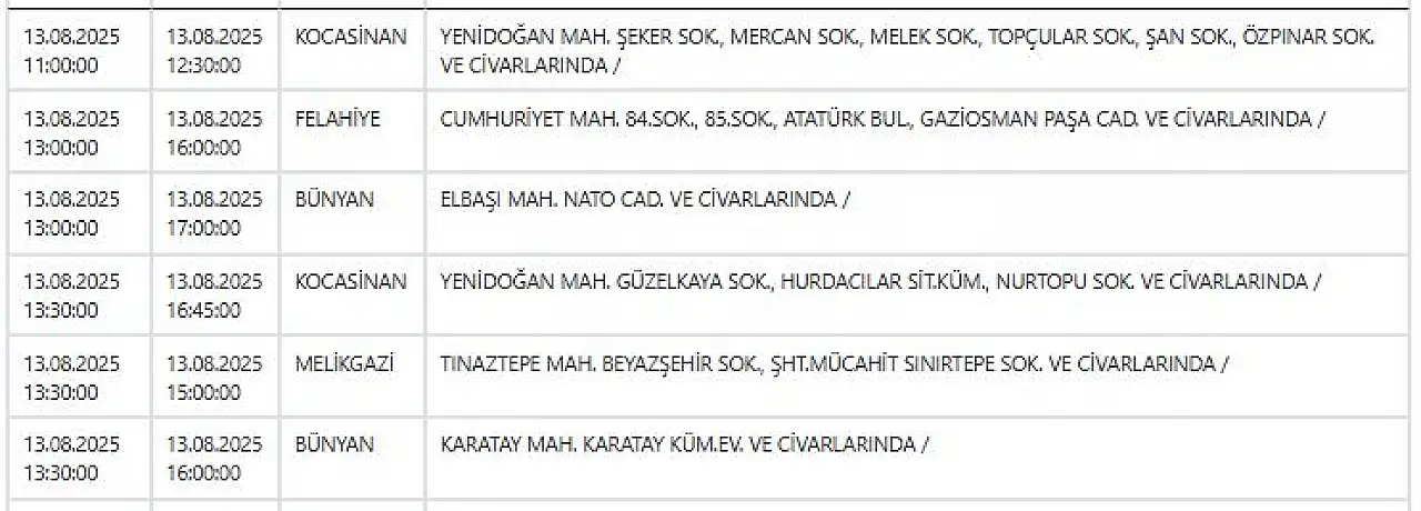 KCETAŞ’tan edinilen bilgilere göre yarın (13 Ağustos 2025) aşağıdaki ilçe ve mahallelerde elektrik kesintisi yaşanacak.